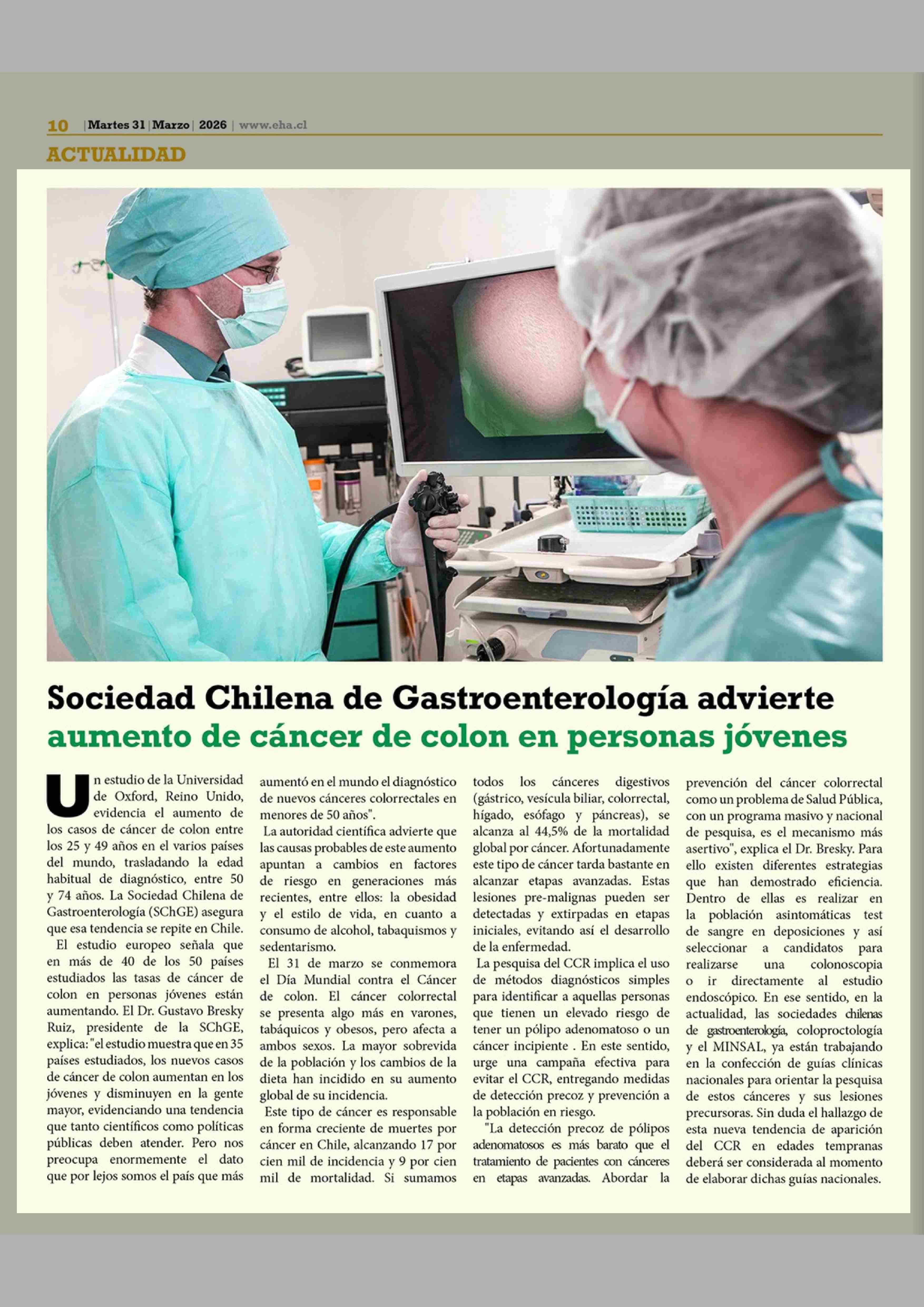Sociedad Chilena de Gastroenterología advierte aumento de cáncer de colon en personas jóvenes 31-03-2026 El Heraldo Austral |