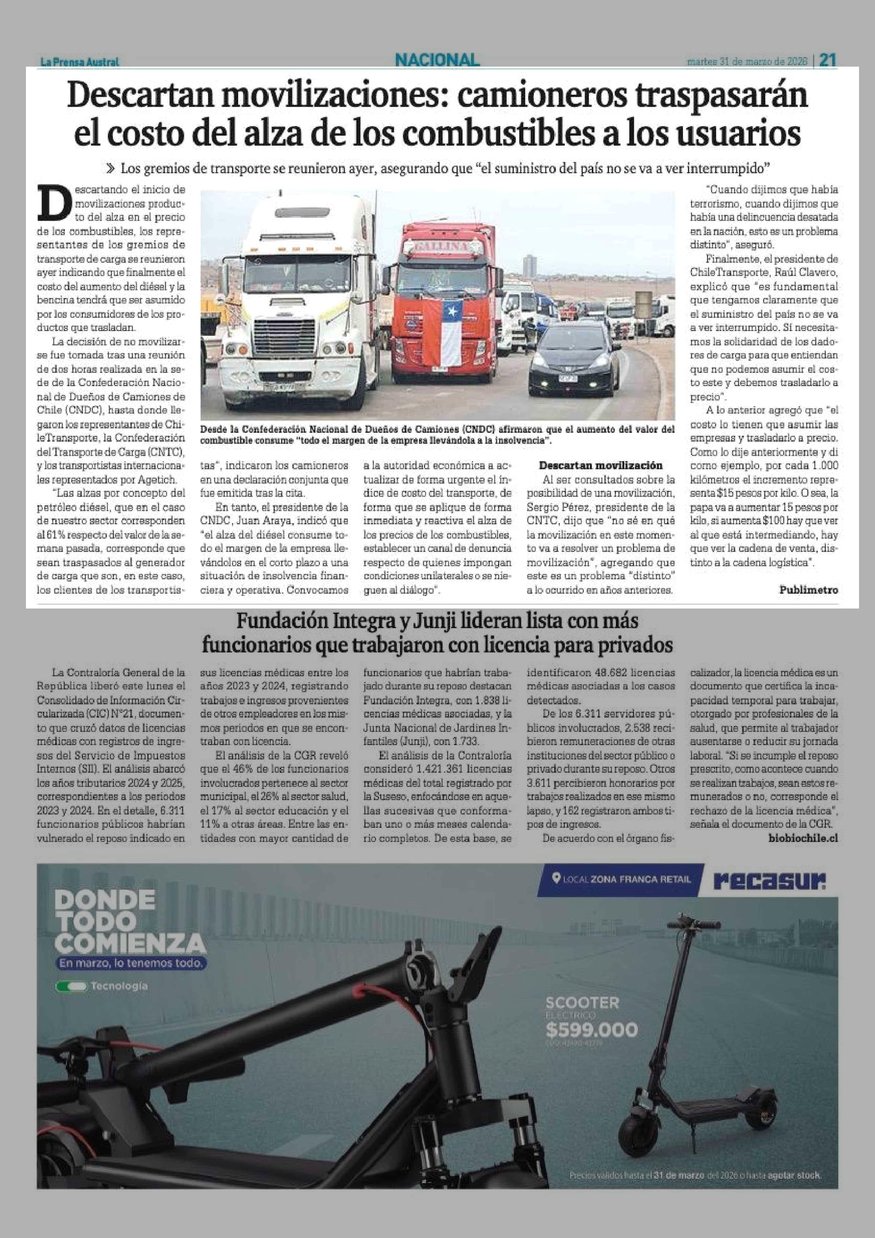 Descartan movilizaciones: camioneros traspasarán el costo del alza de los combustibles a los usuarios 31-03-2026 La Prensa Austral |