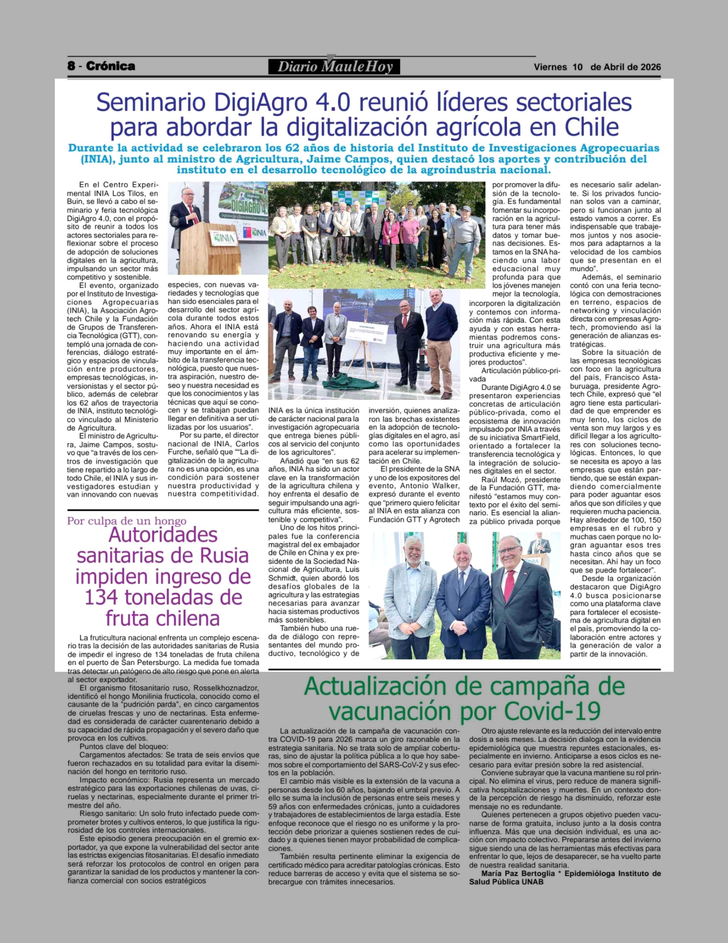 Seminario DigiAgro 4.0 reunió líderes sectoriales para abordar la digitalización agrícola en Chile 10-04-2026 Maule Hoy |
