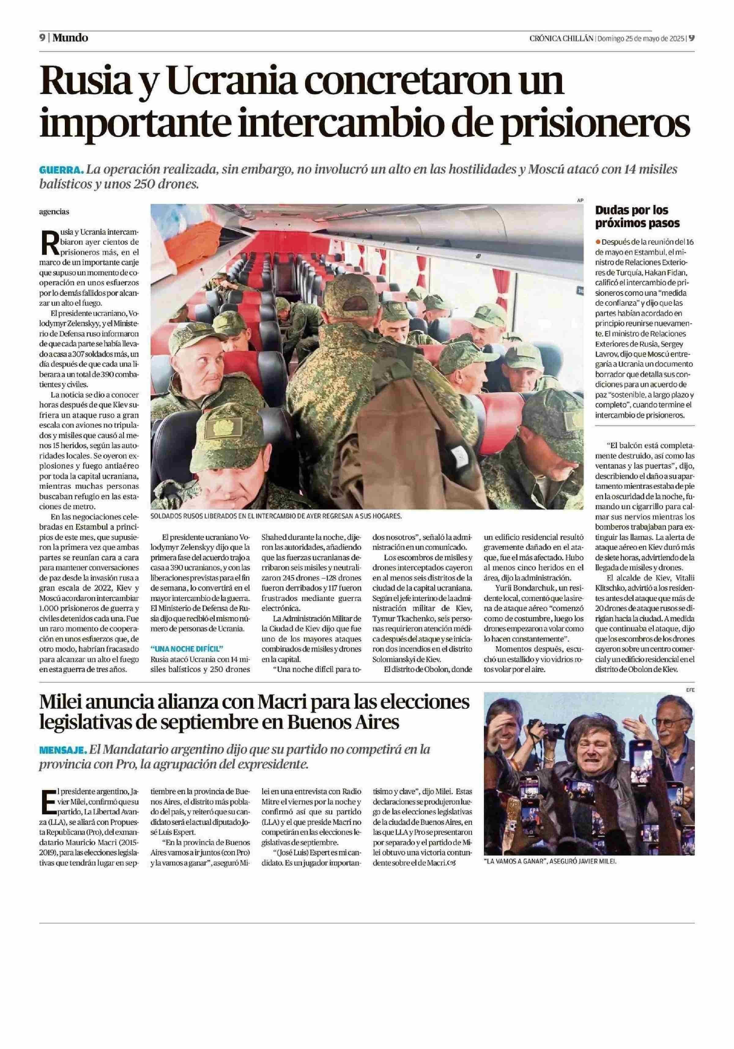 Rusia y Ucrania concretaron un importante intercambio de prisioneros 25-05-2025 Crónica de Chillán |
