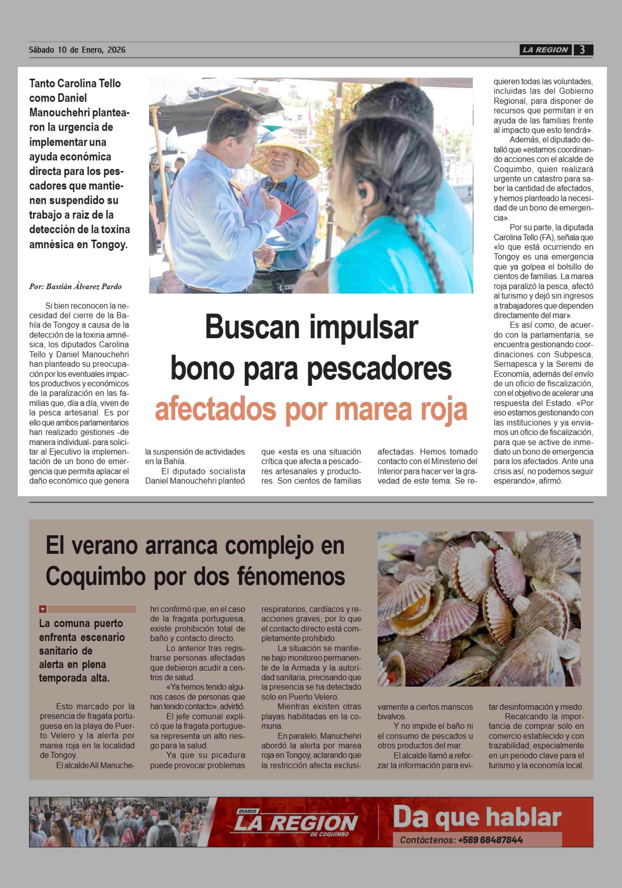 Buscan impulsar bono para pescadores afectados por marea roja 10-01-2026 Diario la Región |