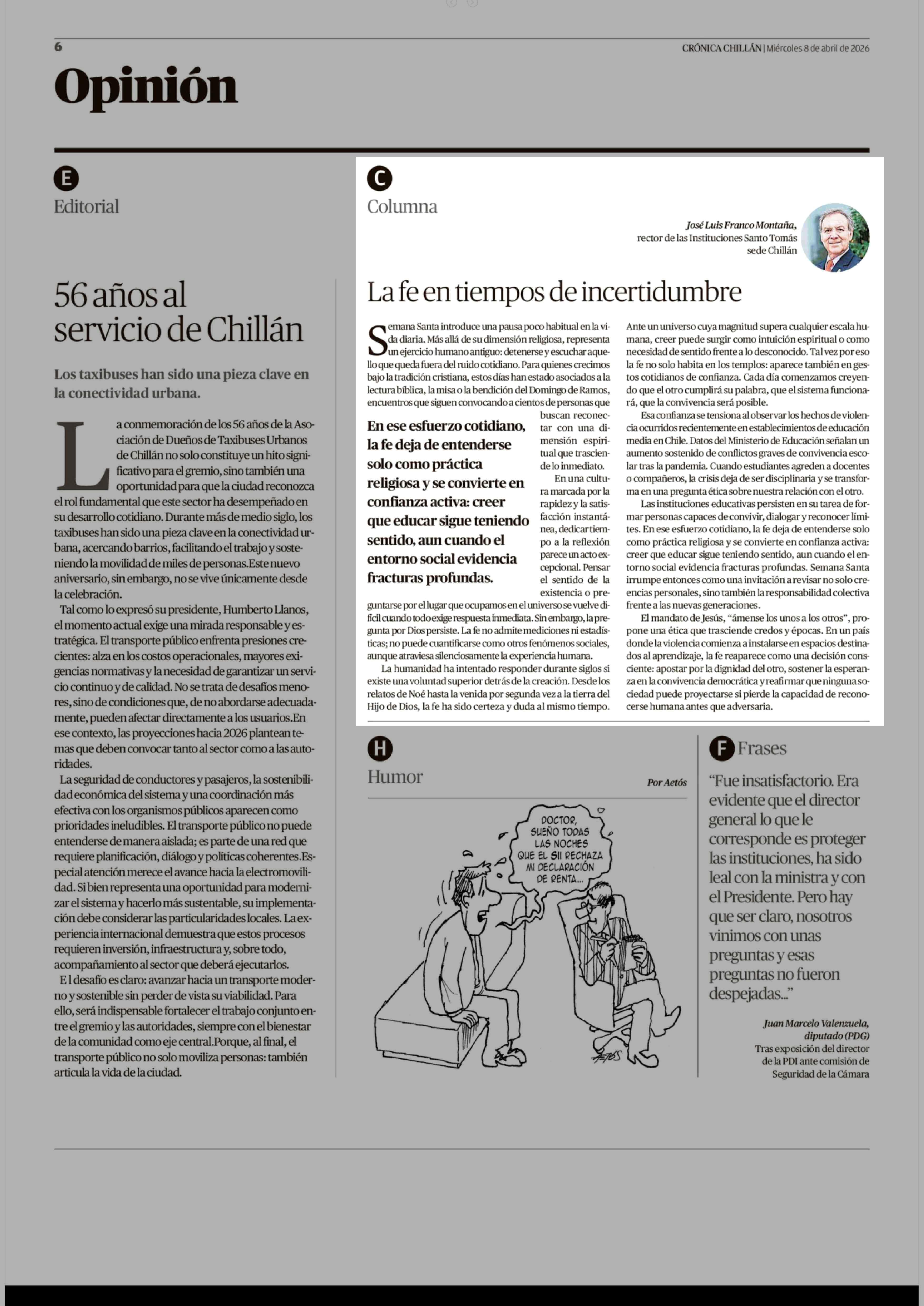 Columnas de Opinión: La fe en tiempos de incertidumbre 08-04-2026 Crónica de Chillán |