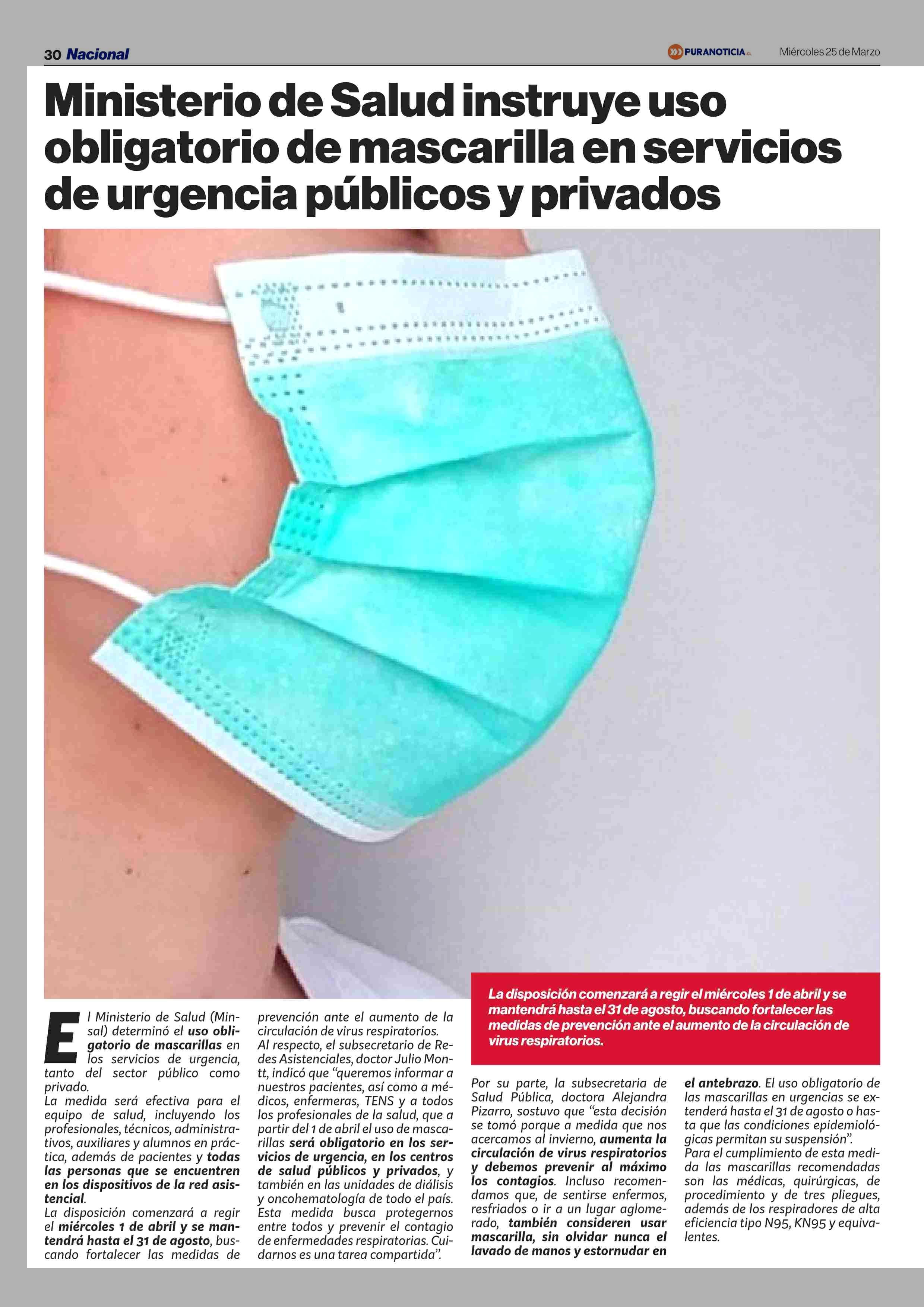 Ministerio de Salud instruye uso obligatorio de mascarilla en servicios de urgencia públicos y privados 25-03-2026 Puranoticia.cl |