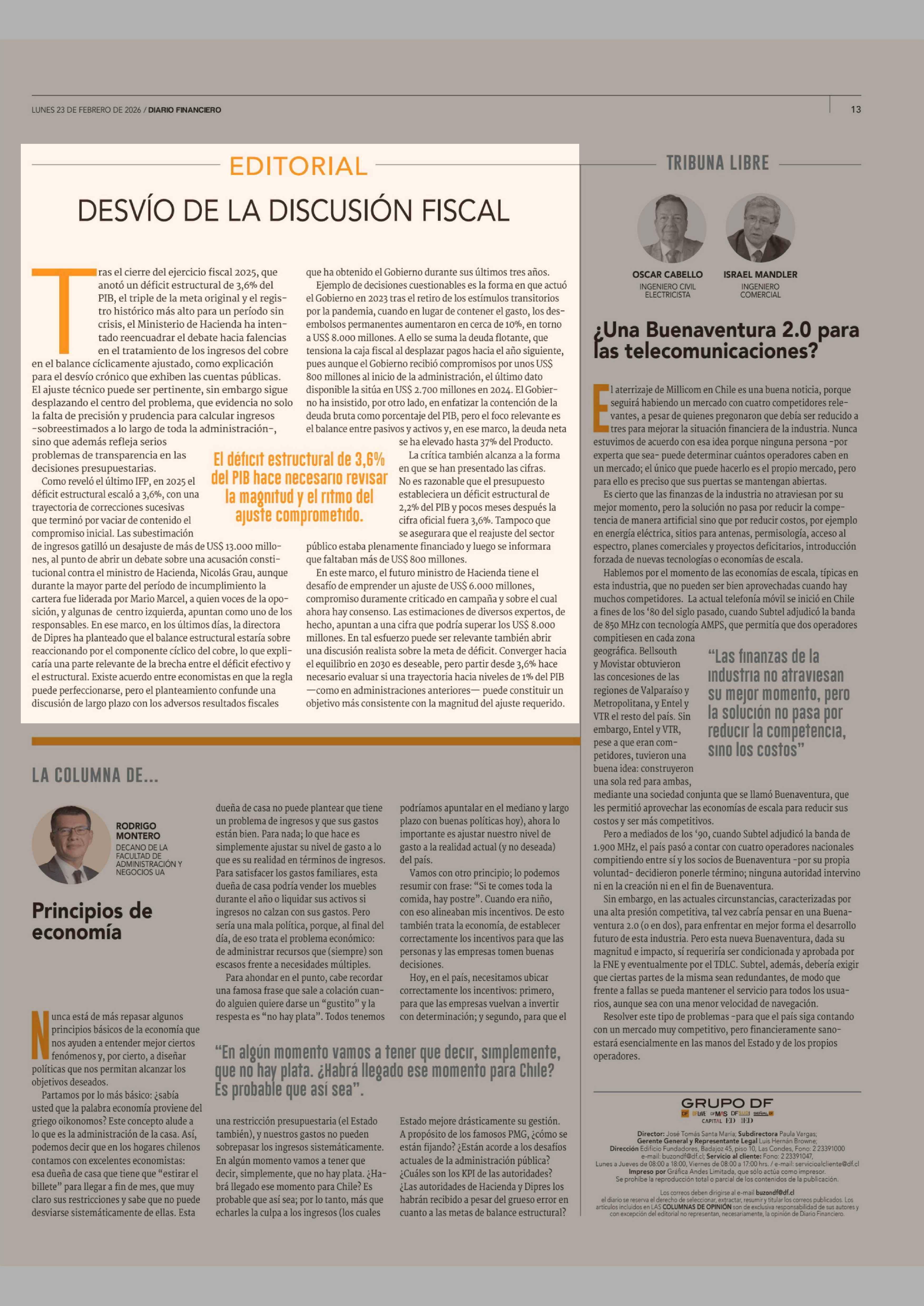 Editorial: DESVÍO DE LA DISCUSIÓN FISCAL 23-02-2026 Diario Financiero |