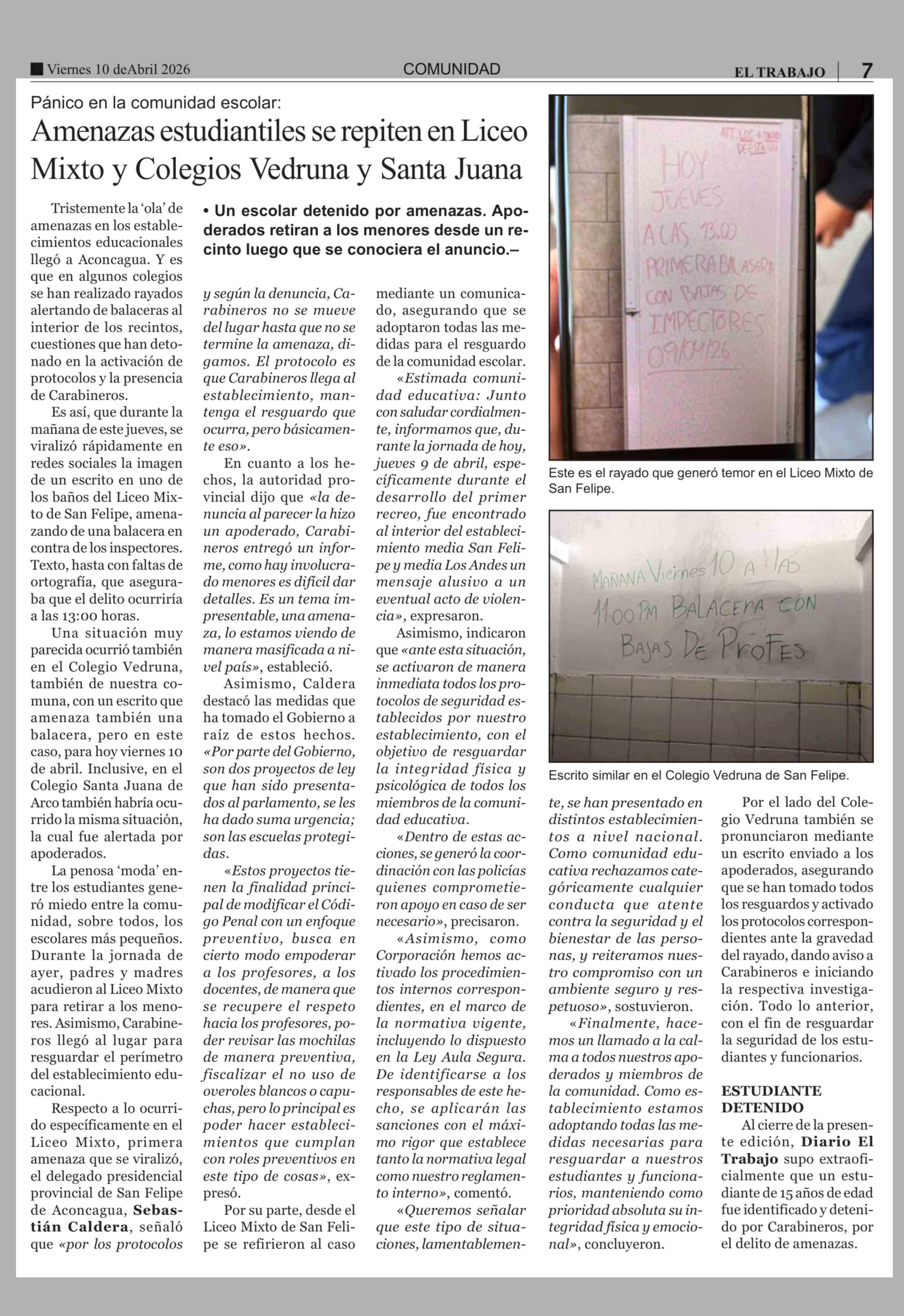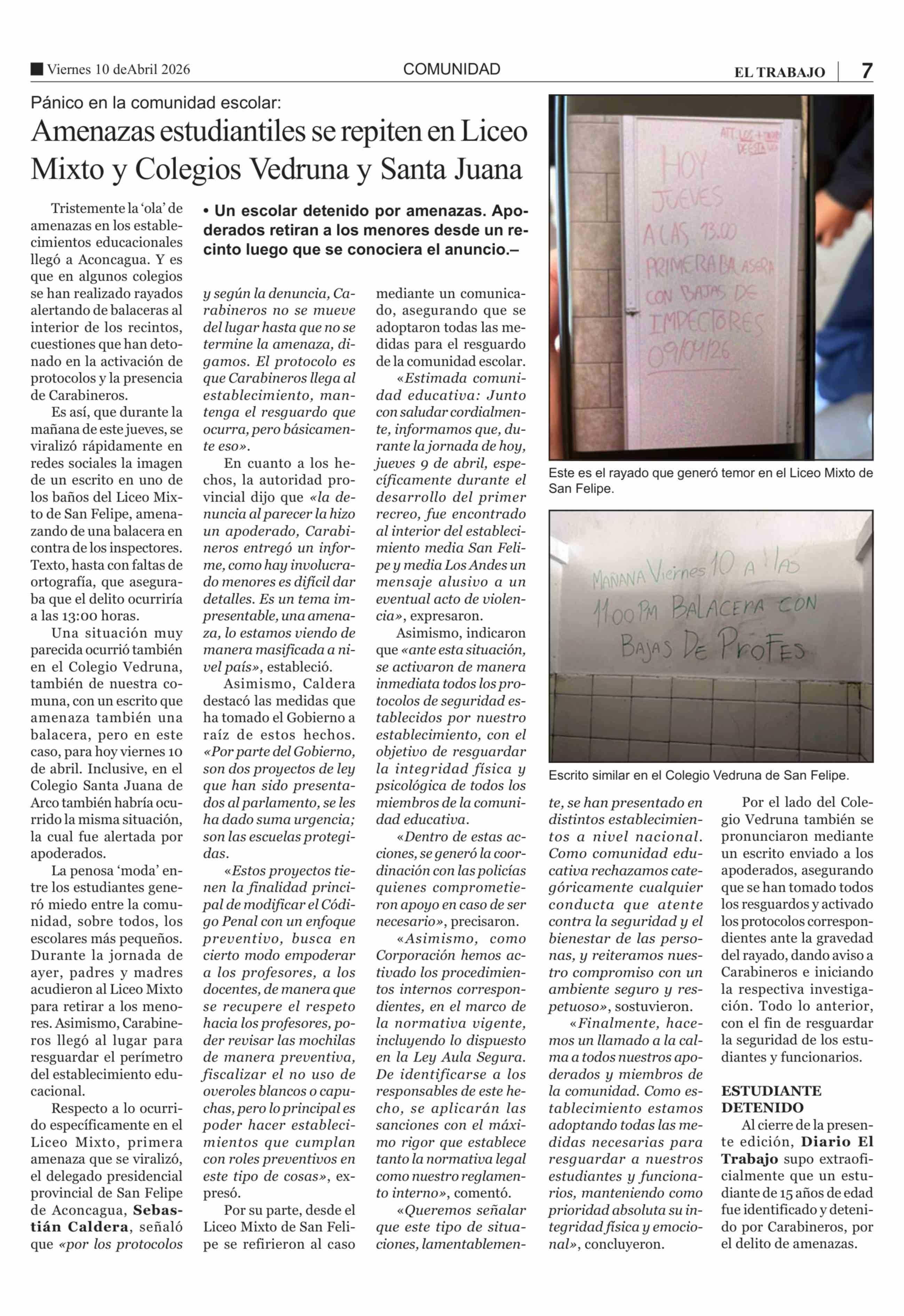 Amenazas estudiantiles se repiten en Liceo Mixto y Colegios Vedruna y Santa Juana 10-04-2026 El Trabajo |