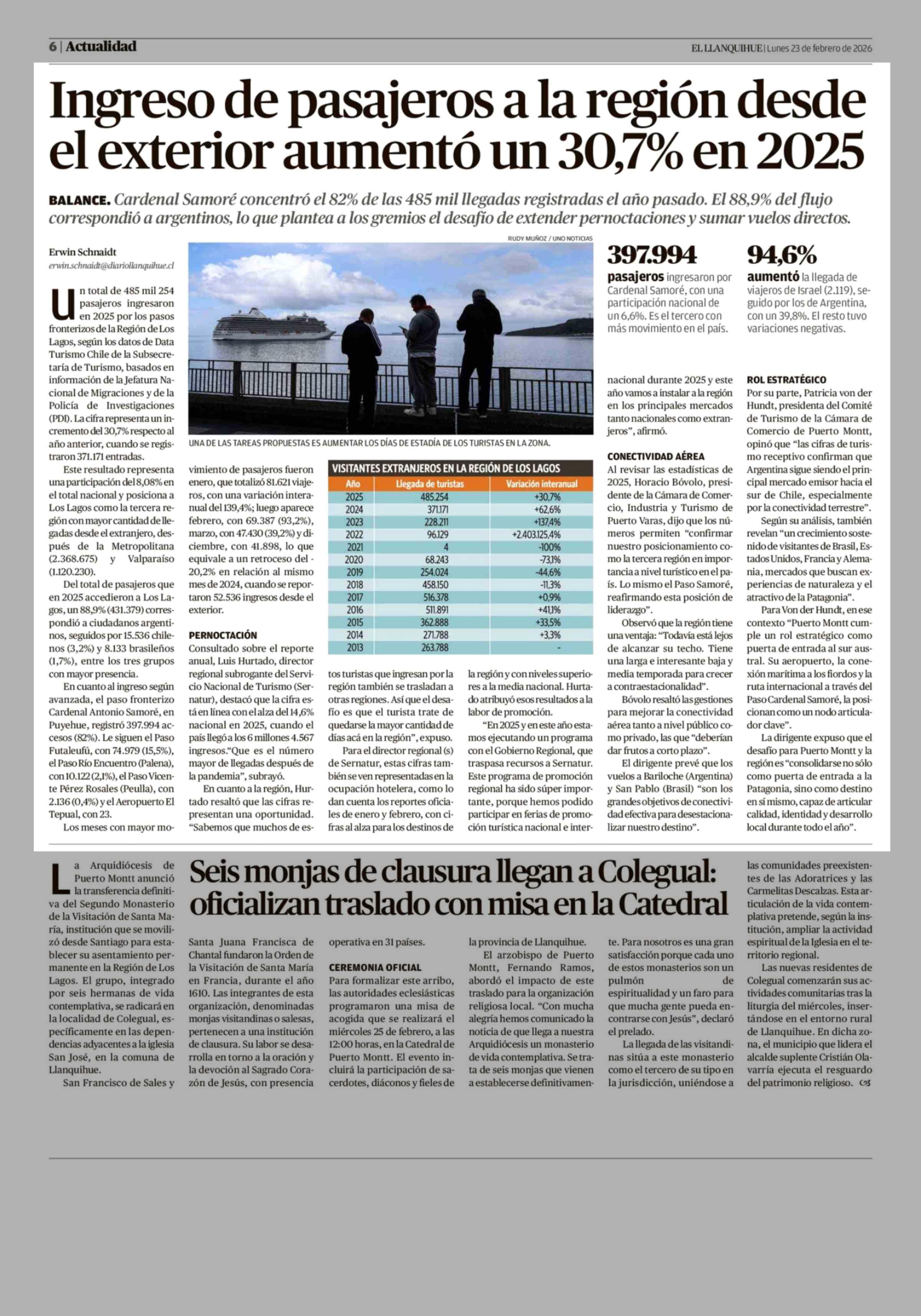 Ingreso de pasajeros a la región desde el exterior aumentó un 30,7% en 2025 23-02-2026 El Llanquihue |