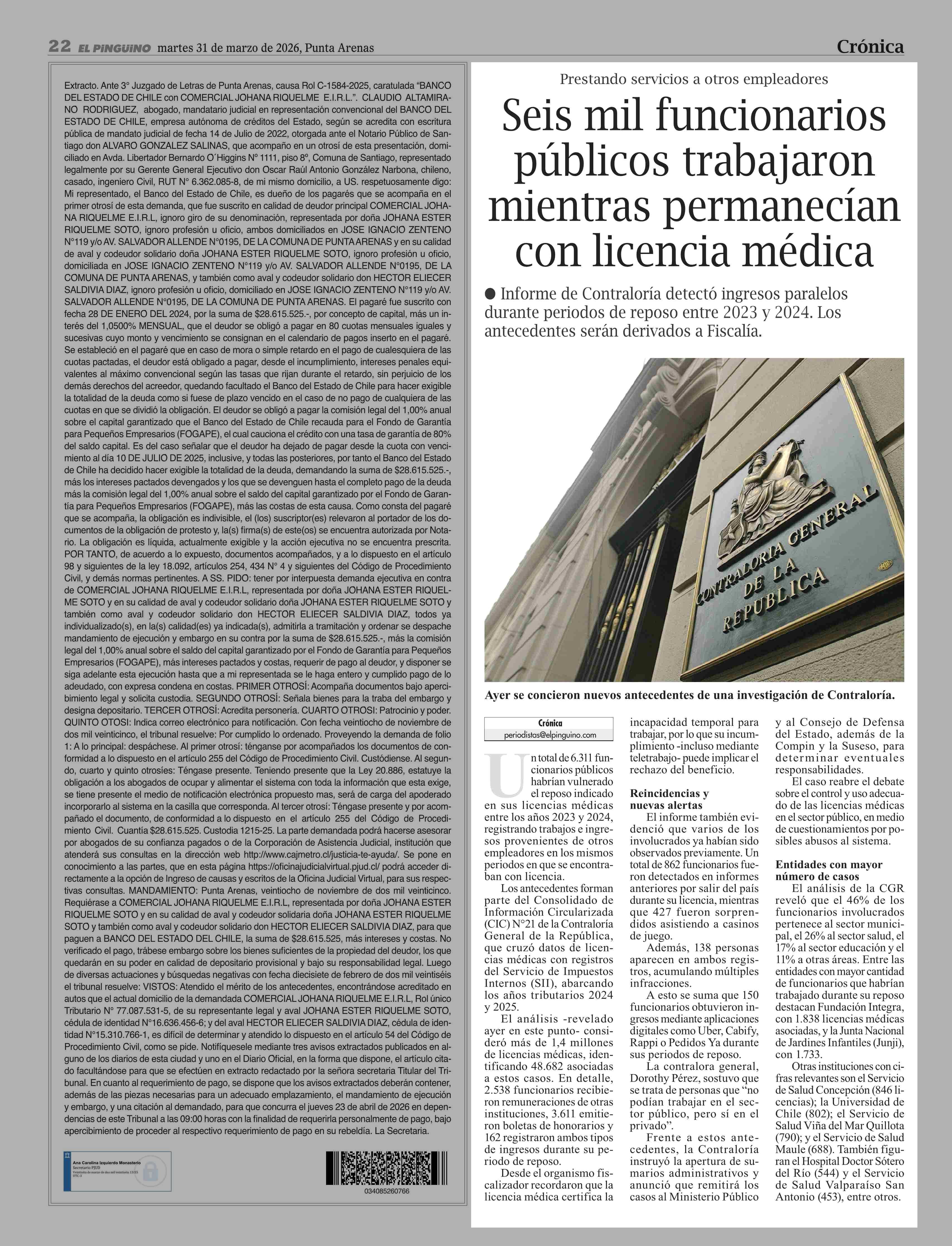 Seis mil funcionarios públicos trabajaron mientras permanecían con licencia médica 31-03-2026 El Pingüino |