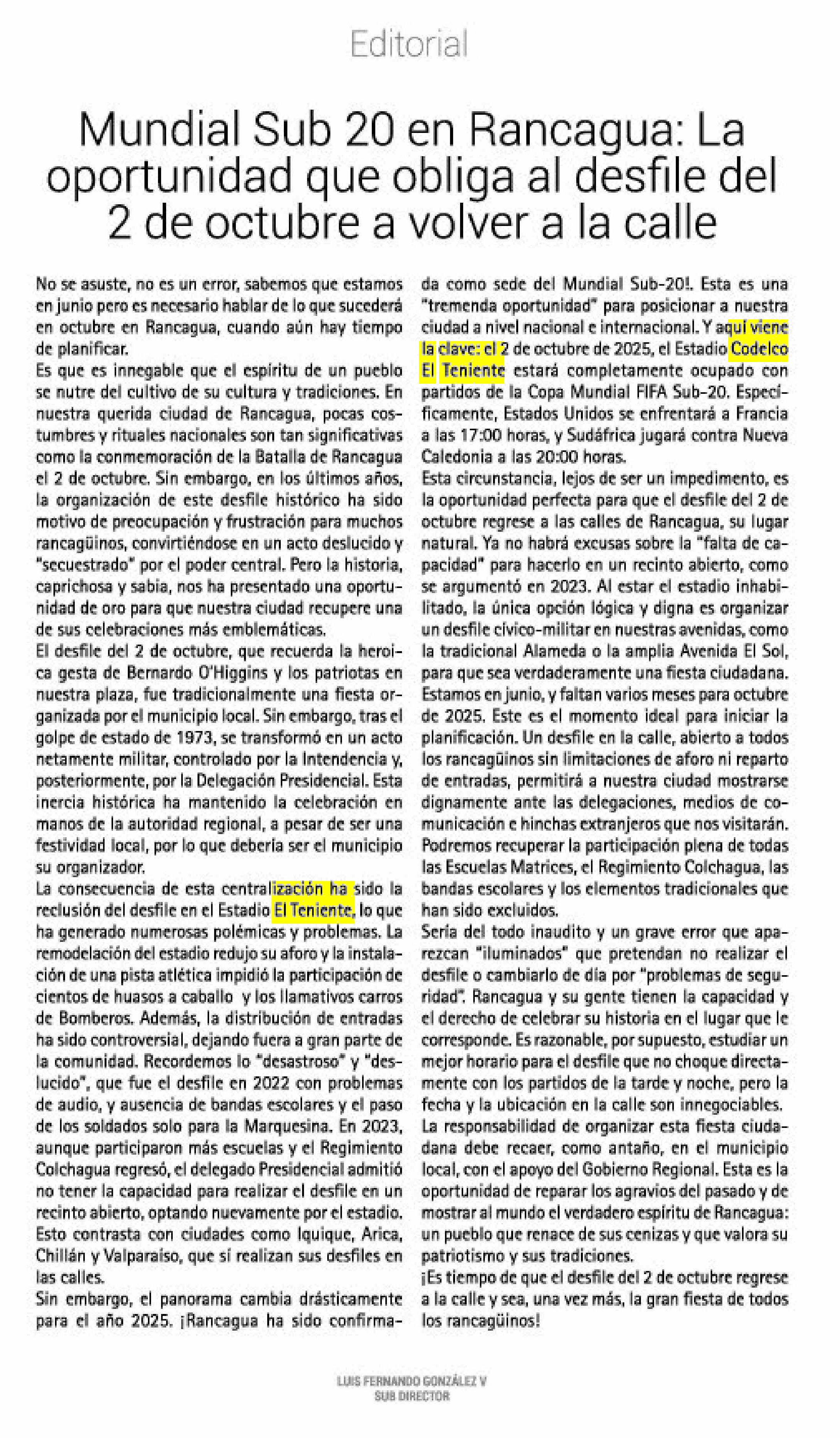 EDITORIAL: Mundial Sub 20 en Rancagua: La oportunidad que obliga al desfile del 2 de octubre a volver a la calle 10-06-2025 El Rancagüino |