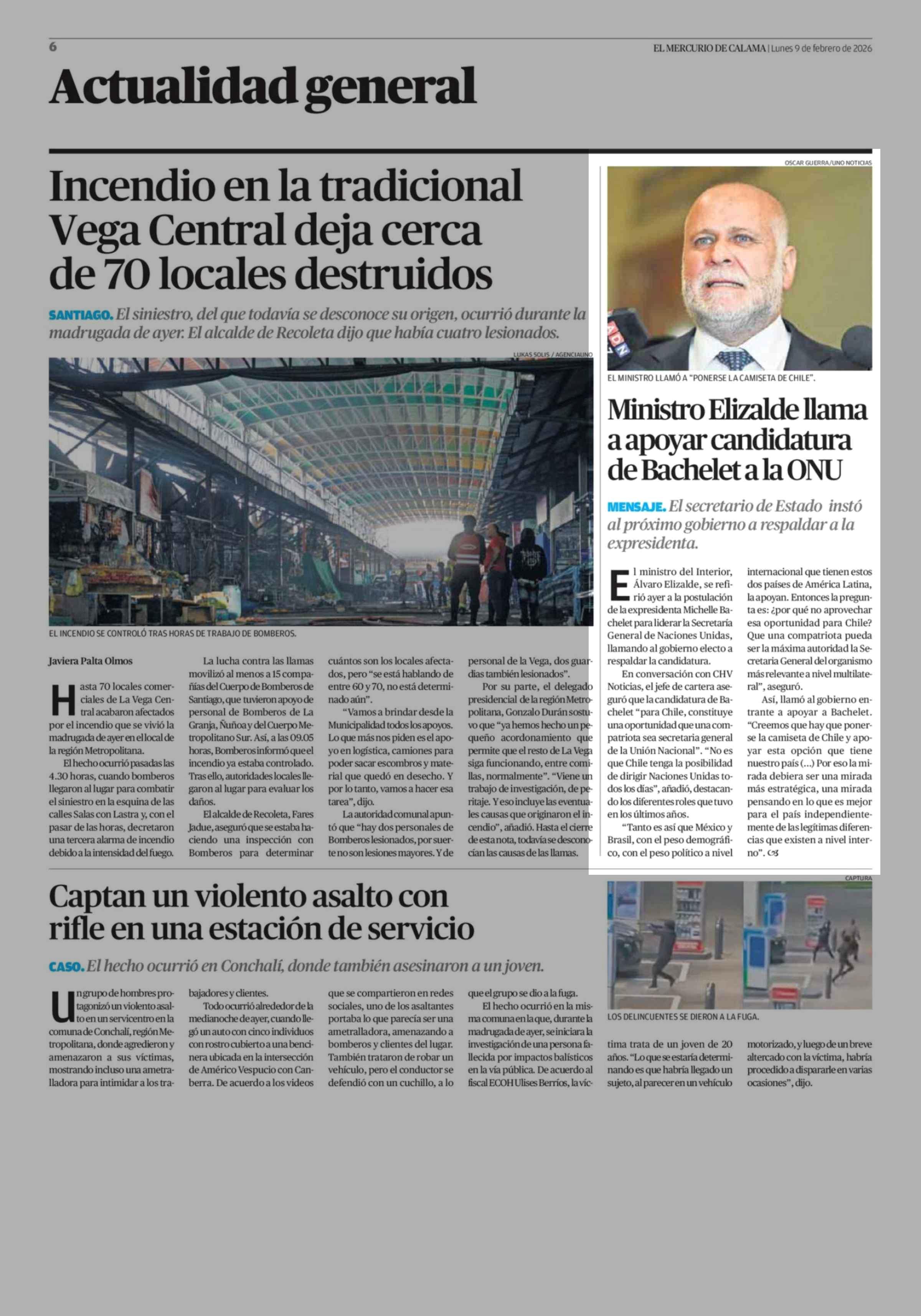 Ministro Elizalde llama a apoyar candidatura de Bachelet a la ONU 09-02-2026 El Mercurio de Calama |