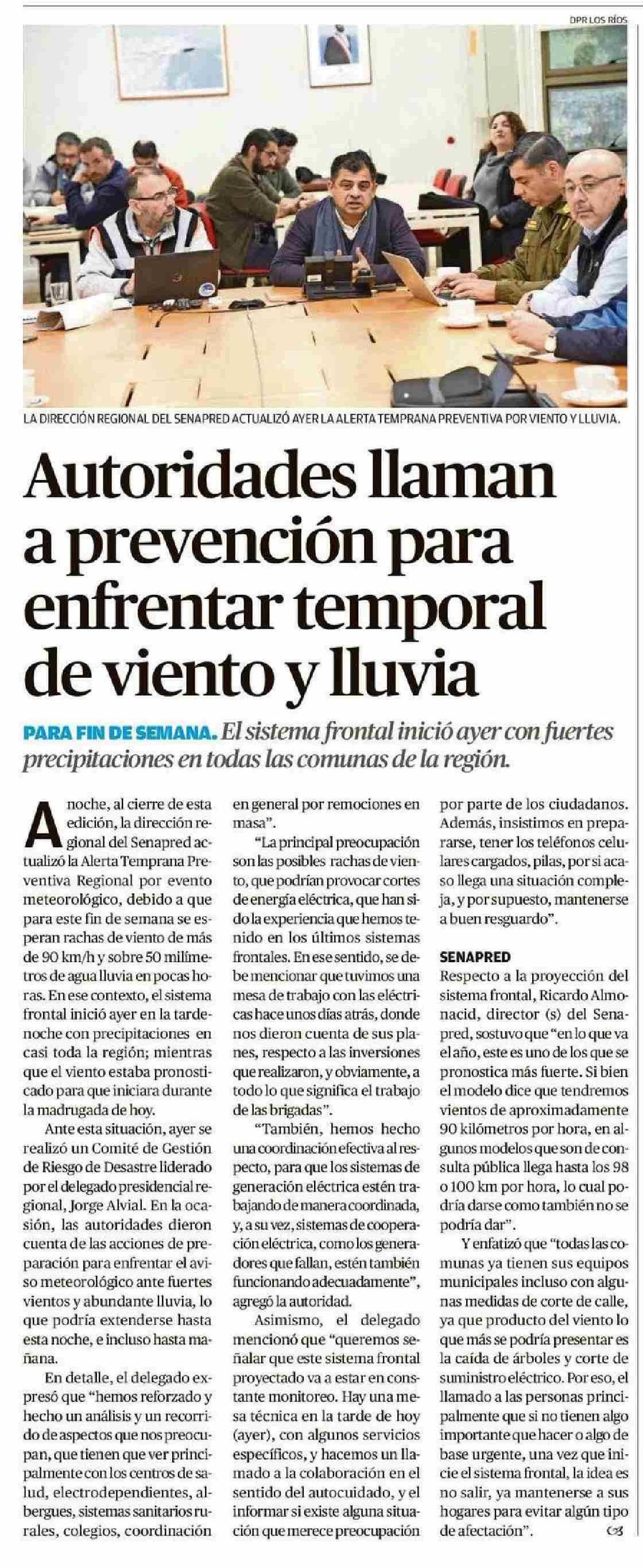 Autoridades llaman enfrentar temporal de viento y lluvia a prevención para 17-05-2025 Diario Austral Región de Los Ríos |