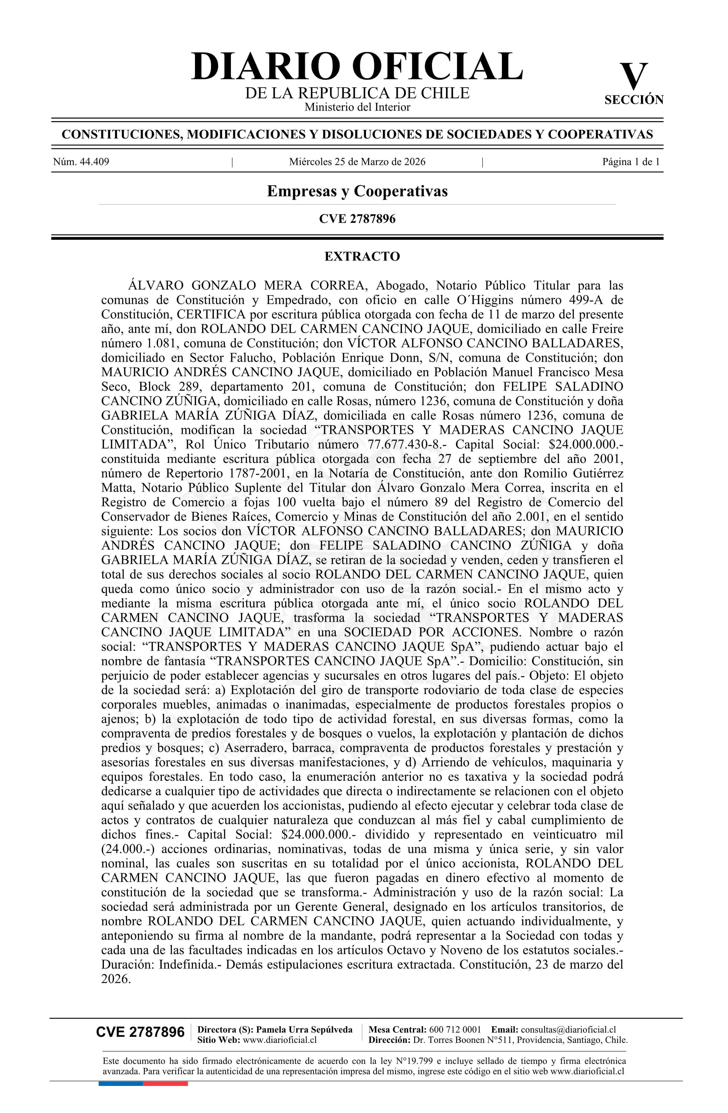 Transportes y Maderas Cancino Jaque Limitada 77.677.430-8* 25-03-2026 Diario Oficial Edición Electrónica |