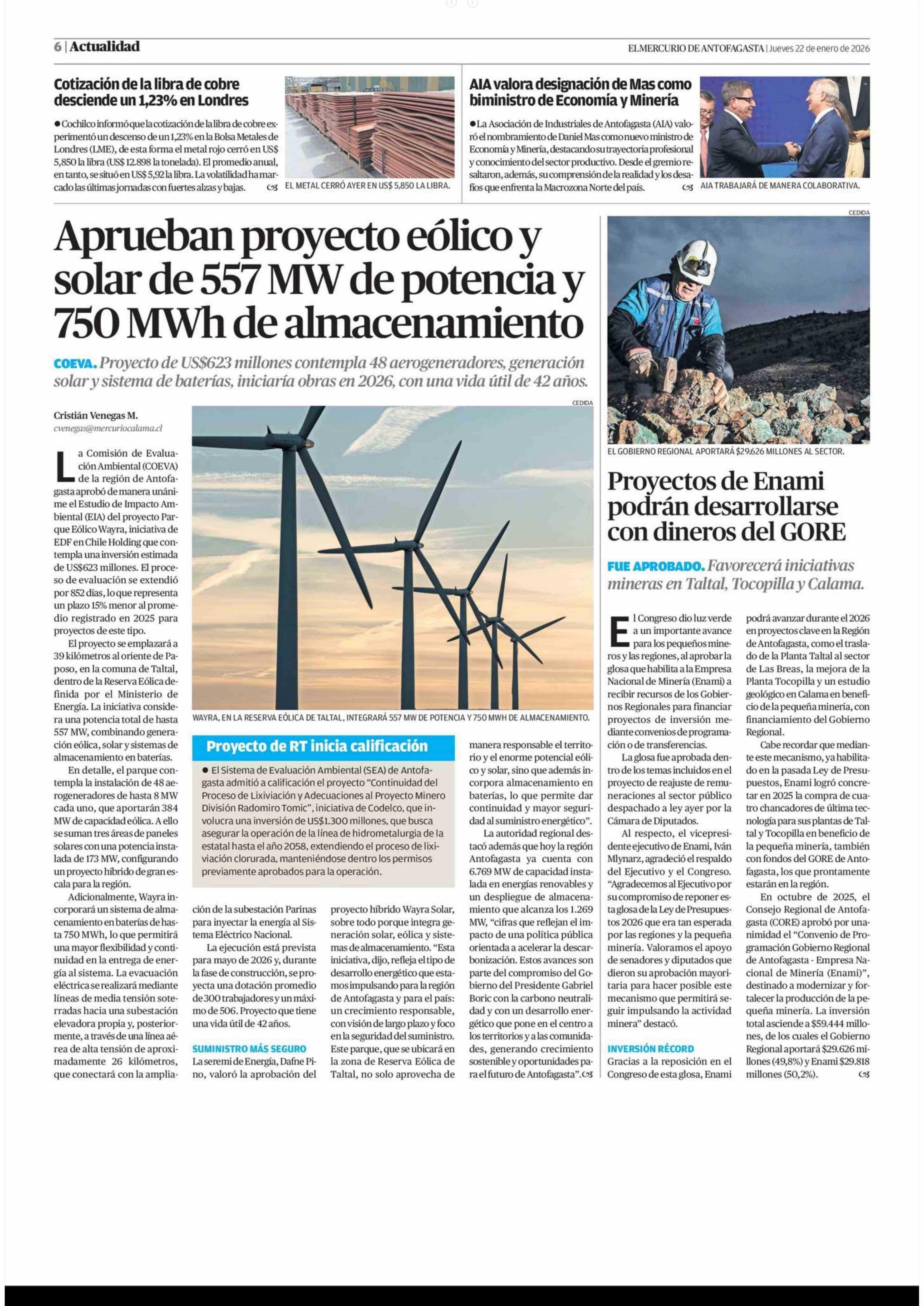 Aprueban proyecto eólico y solar de 557 MW de potencia y 750 MWh de almacenamiento 22-01-2026 El Mercurio de Antofagasta |