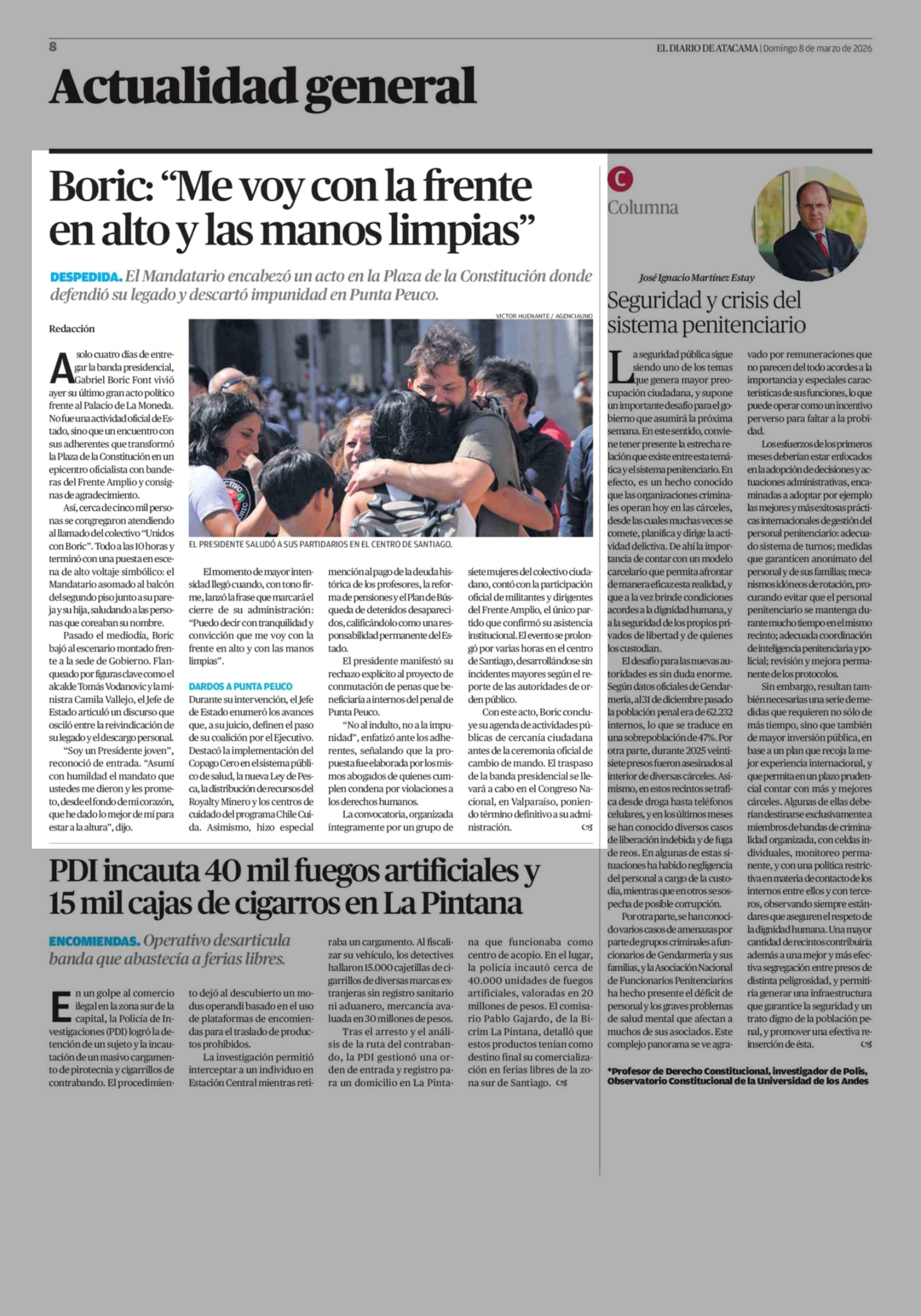 Boric: "Me voy con la frente en alto y las manos limpias" 08-03-2026 El Diario de Atacama |