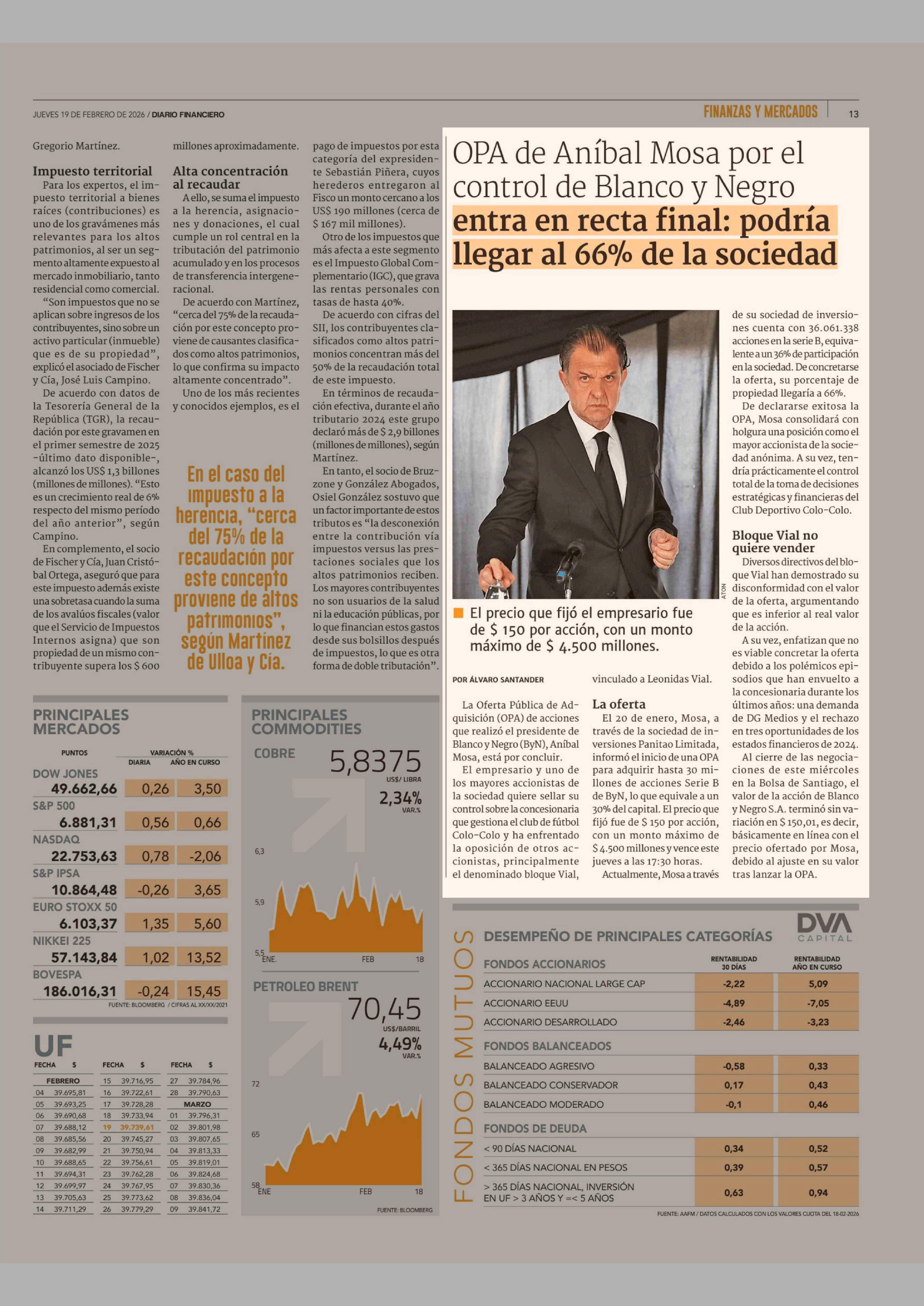 OPA de Aníbal Mosa por el control de Blanco y Negro entra en recta final: podría llegar al 66% de la sociedad 19-02-2026 Diario Financiero |