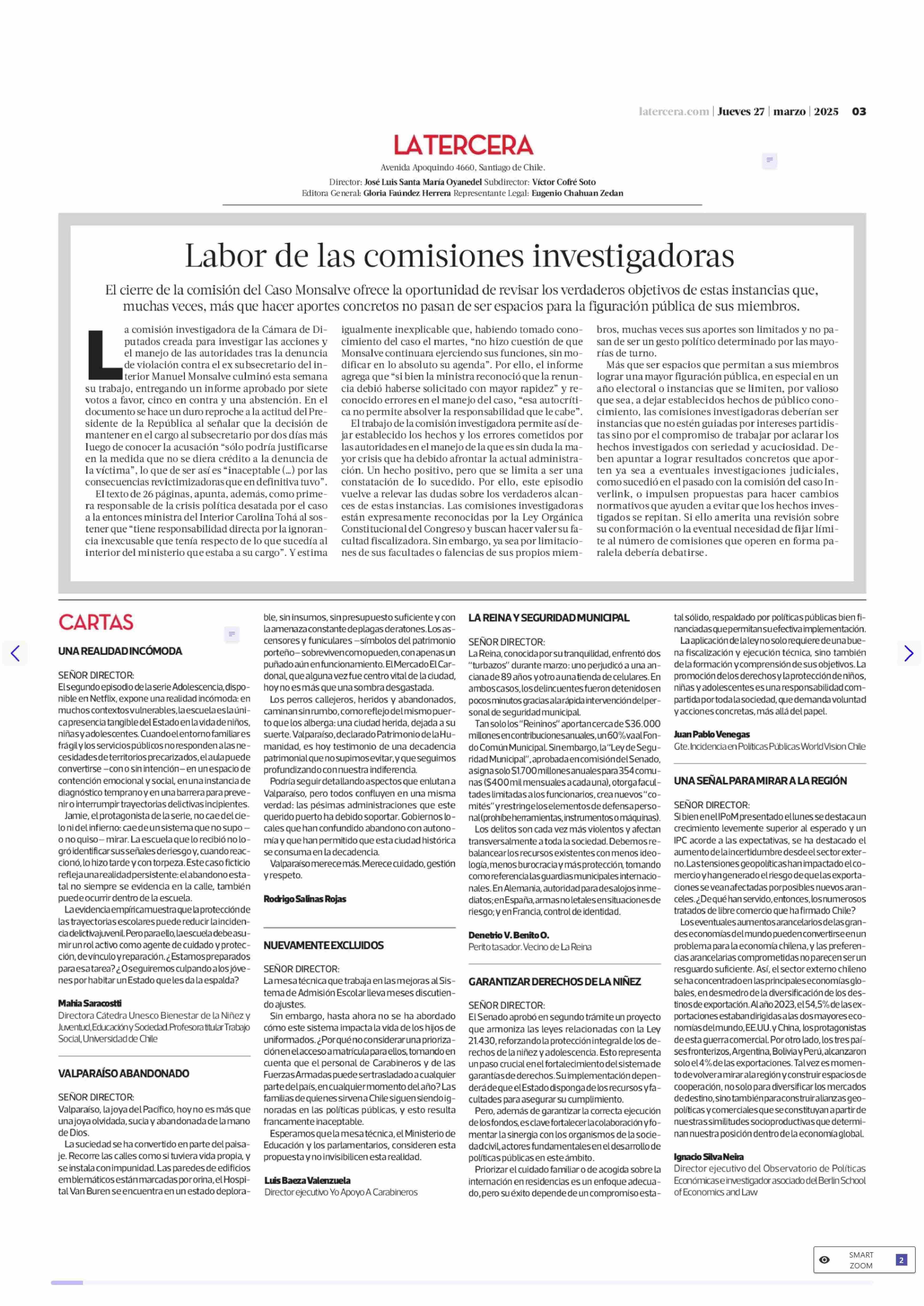 CARTAS: UNA REALIDAD INCÓMODA 27-03-2025 La Tercera |