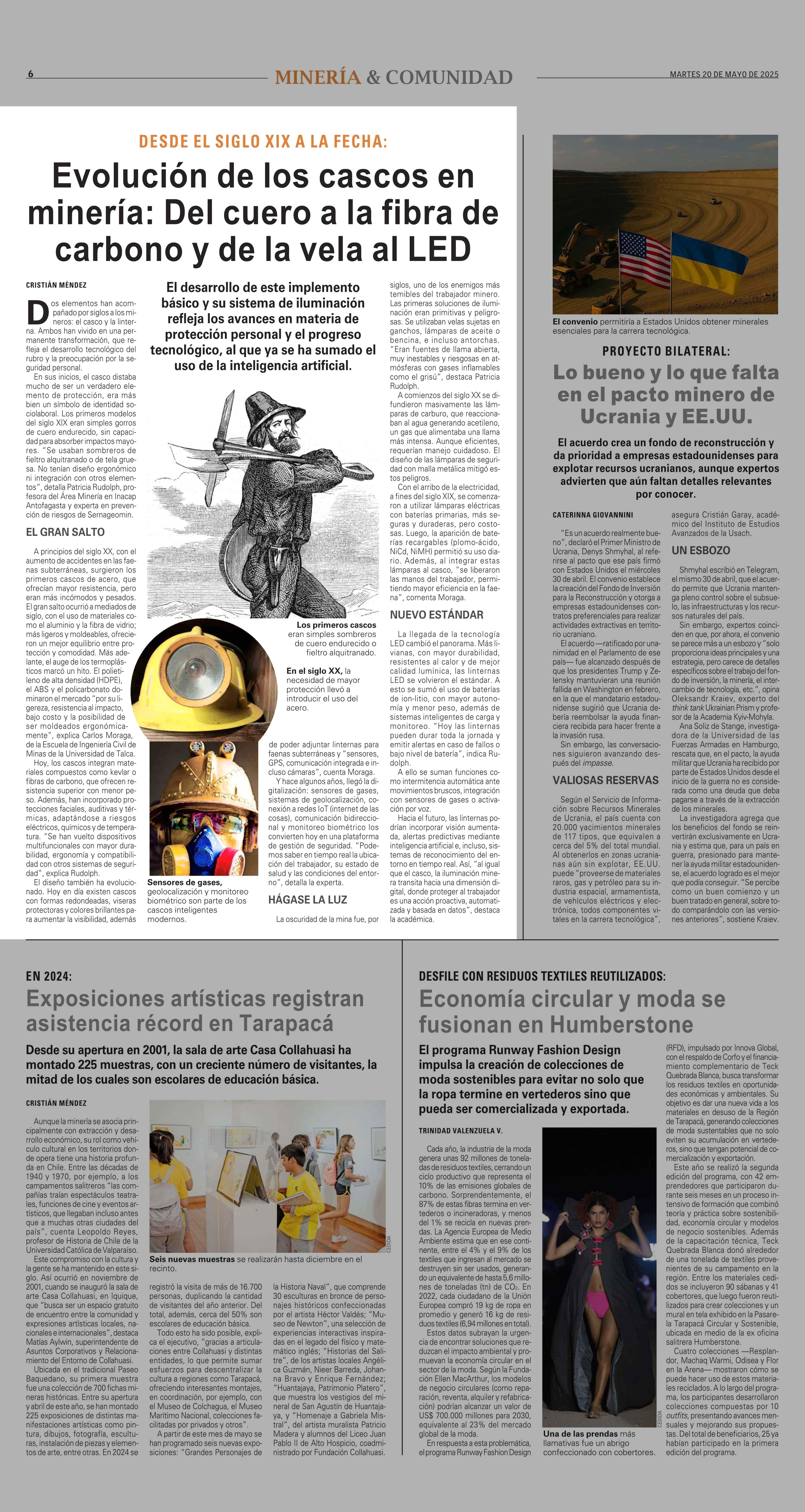 Evolución de los cascos en minería: Del cuero a la fibra de carbono y de la vela al LED 20-05-2025 El Mercurio |