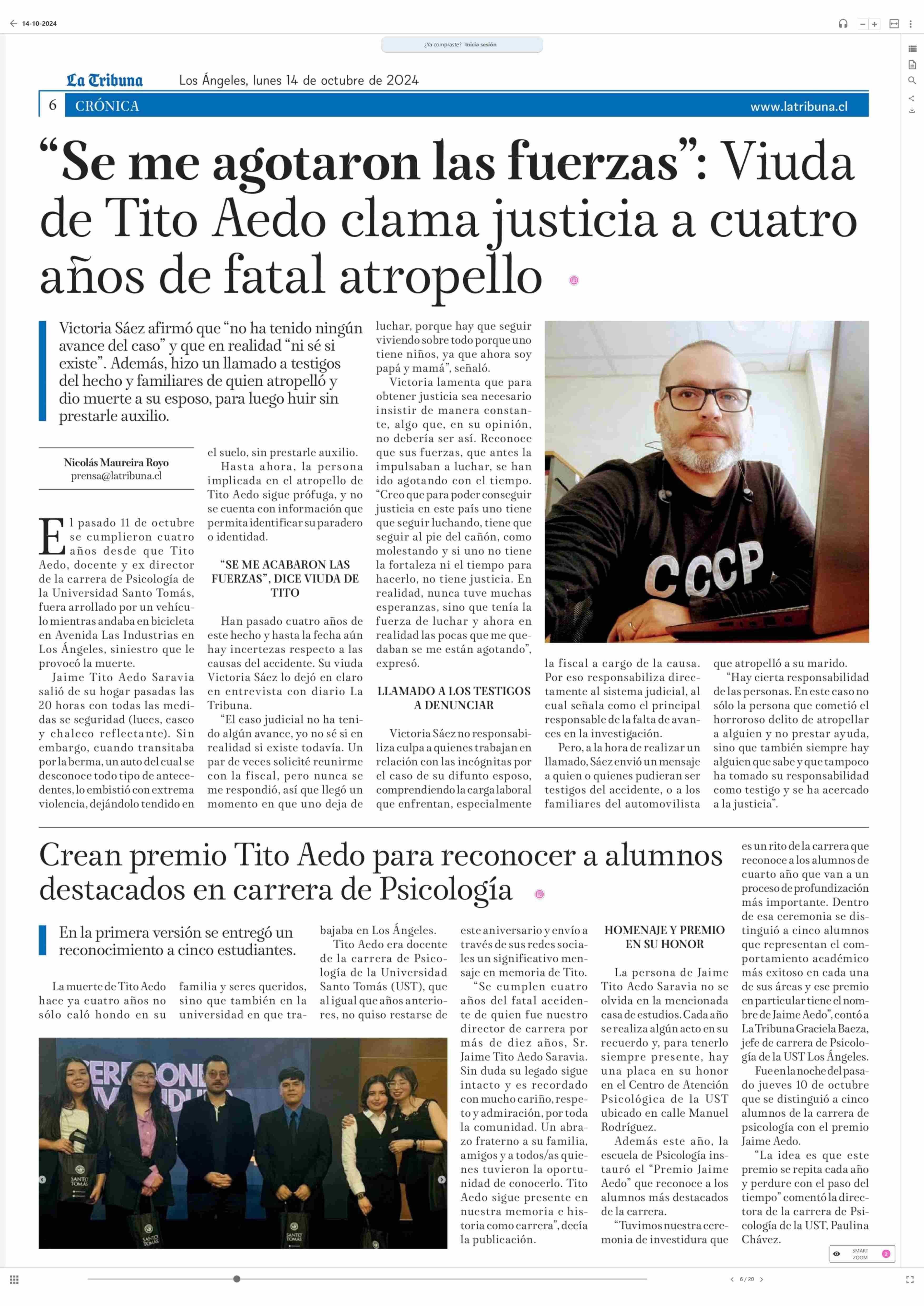 Crean premio Tito Aedo para reconocer a alumnos destacados en carrera de Psicología 14-10-2024 La Tribuna |