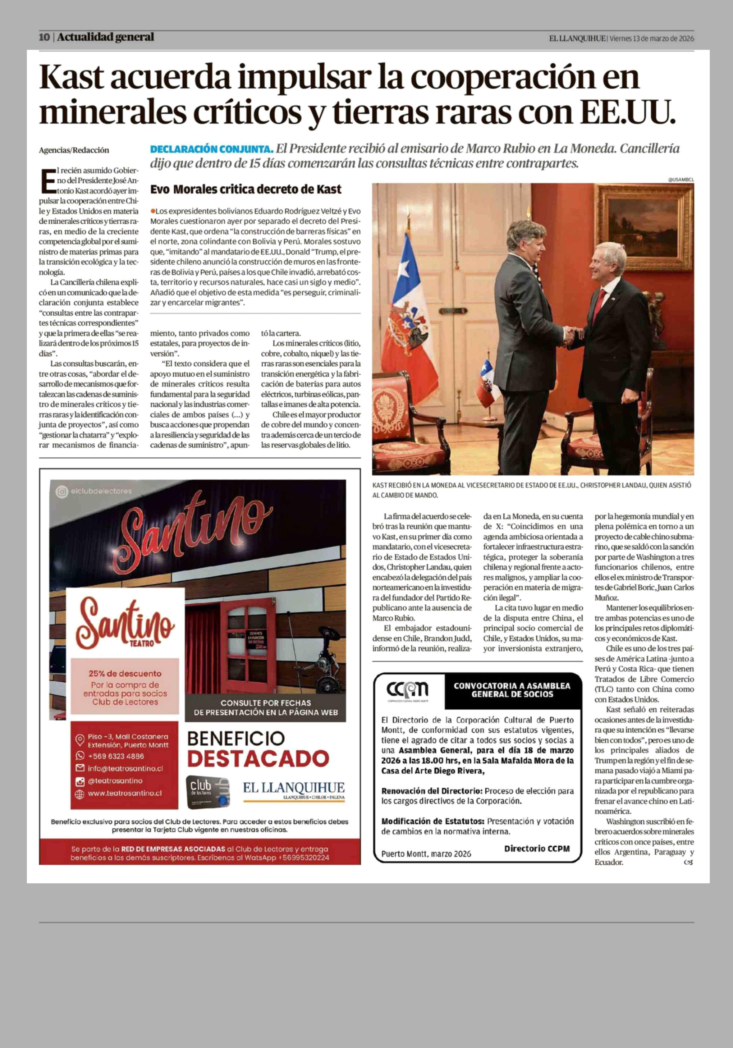Kast acuerda impulsar la cooperación en minerales críticos y tierras raras con EE.UU. 13-03-2026 El Llanquihue |