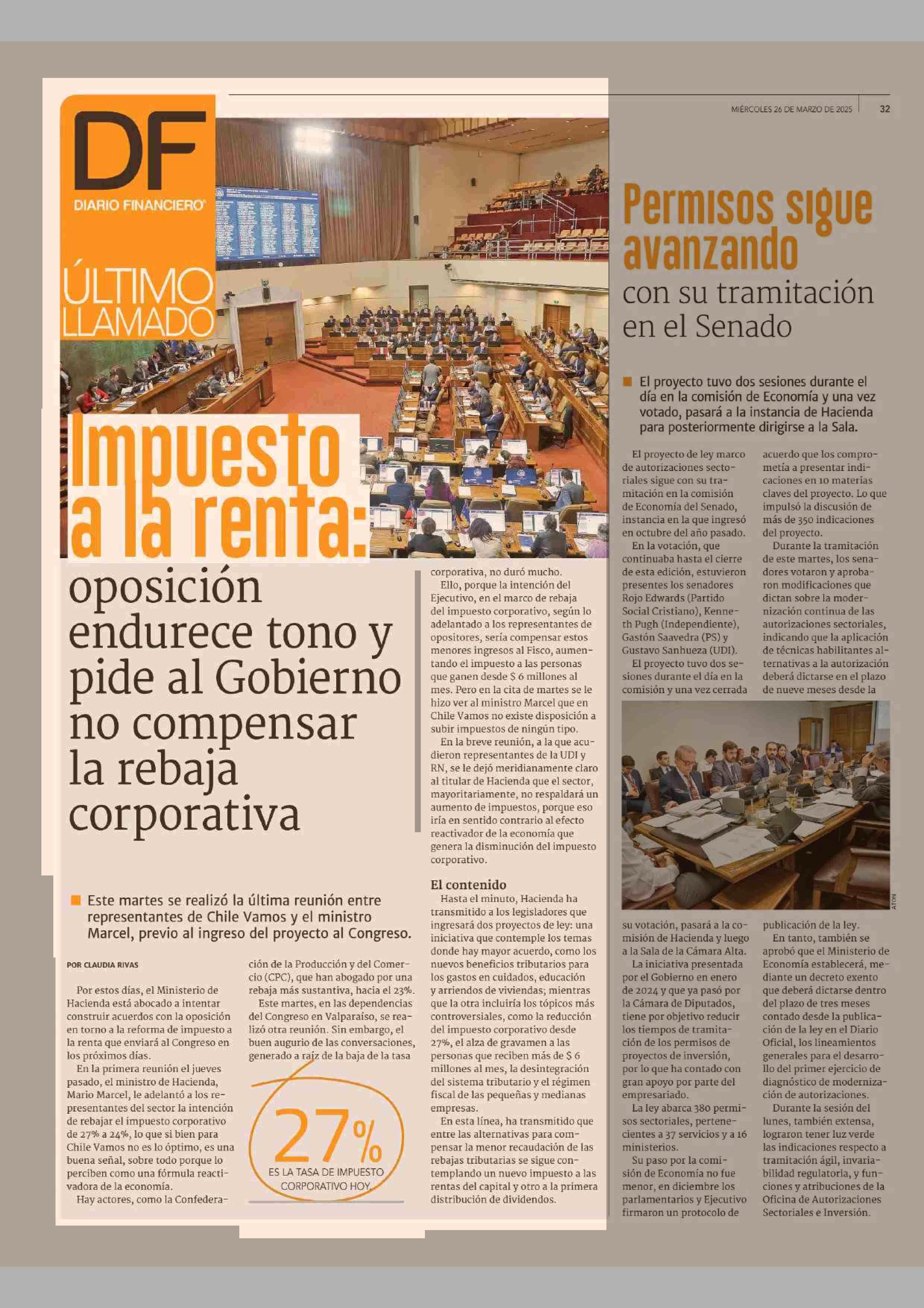 Impuesto a la renta: oposición endurece tono y pide al Gobierno no compensar la rebaja corporativa 26-03-2025 Diario Financiero |