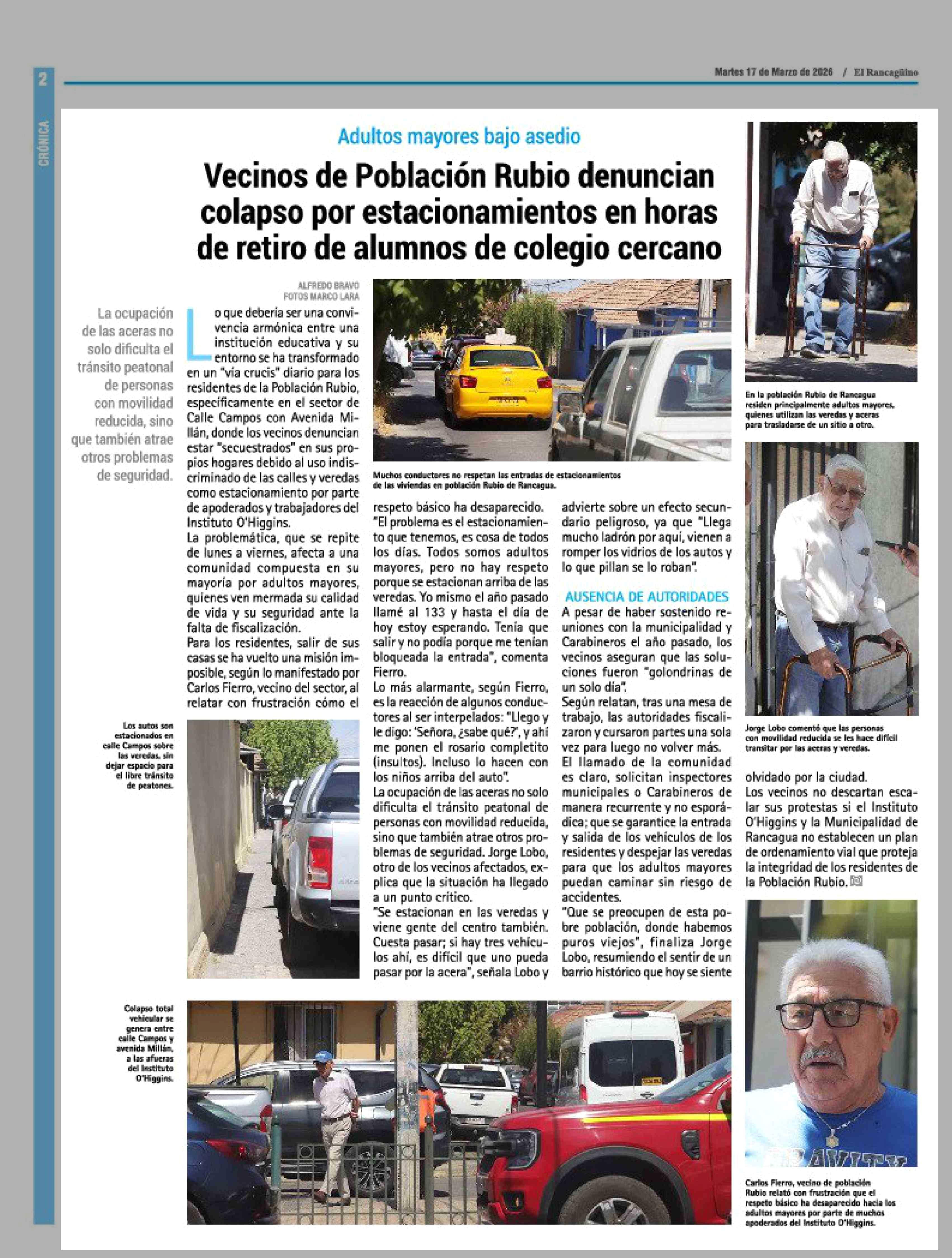 Vecinos de Población Rubio denuncian colapso por estacionamientos en horas de retiro de alumnos de colegio cercano 17-03-2026 El Rancagüino |