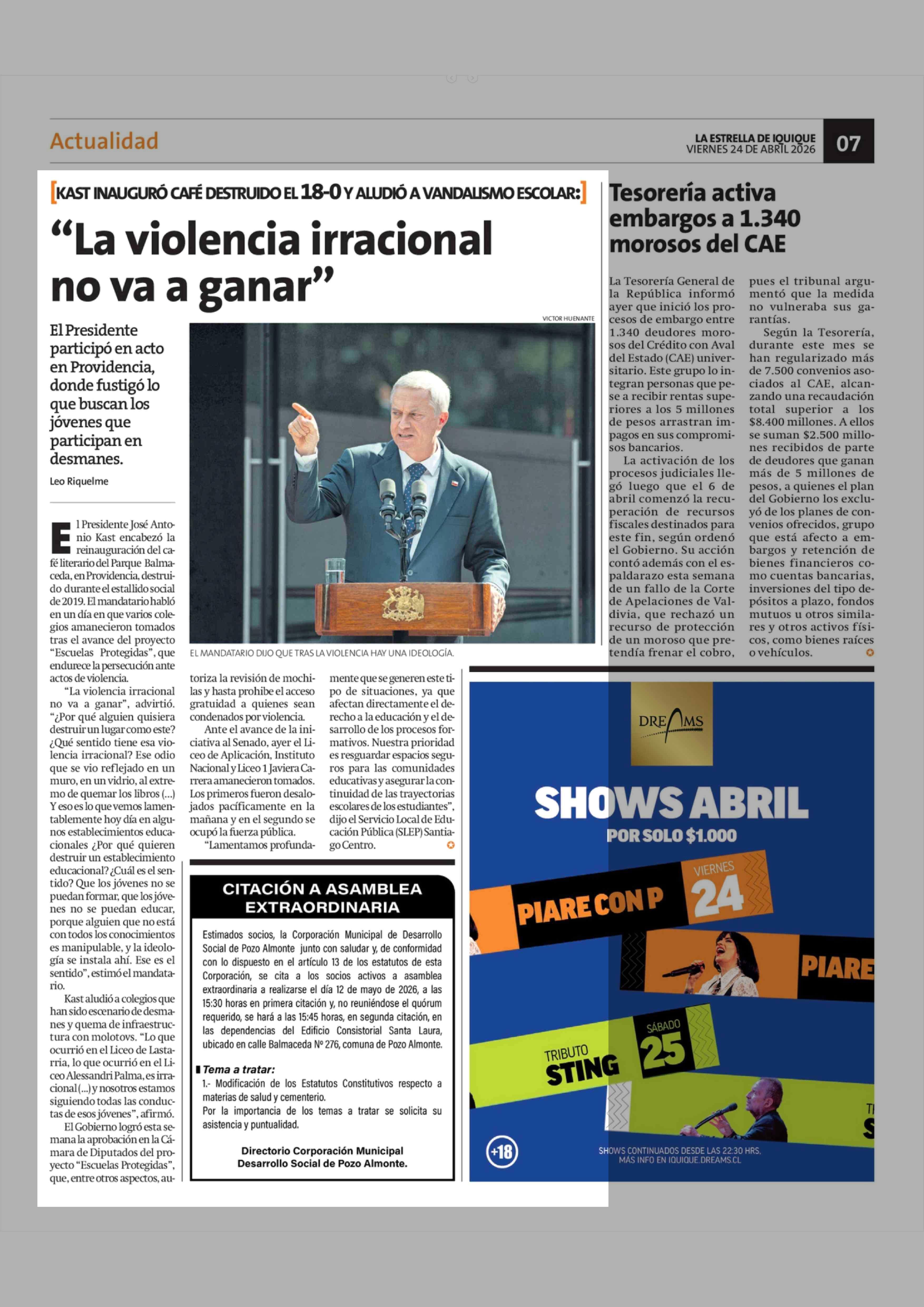 "La violencia irracional no va a ganar" 24-04-2026 La Estrella de Iquique |