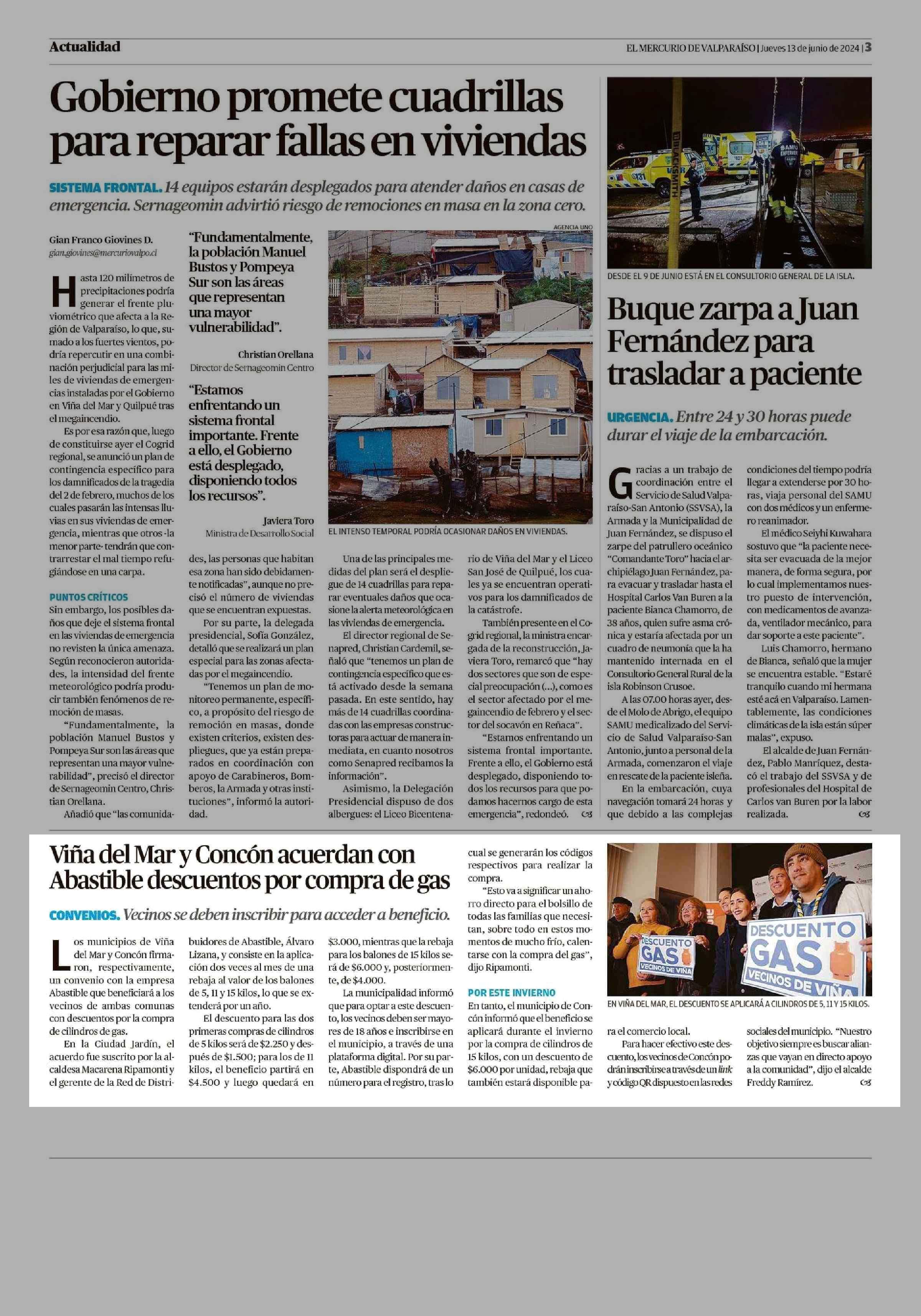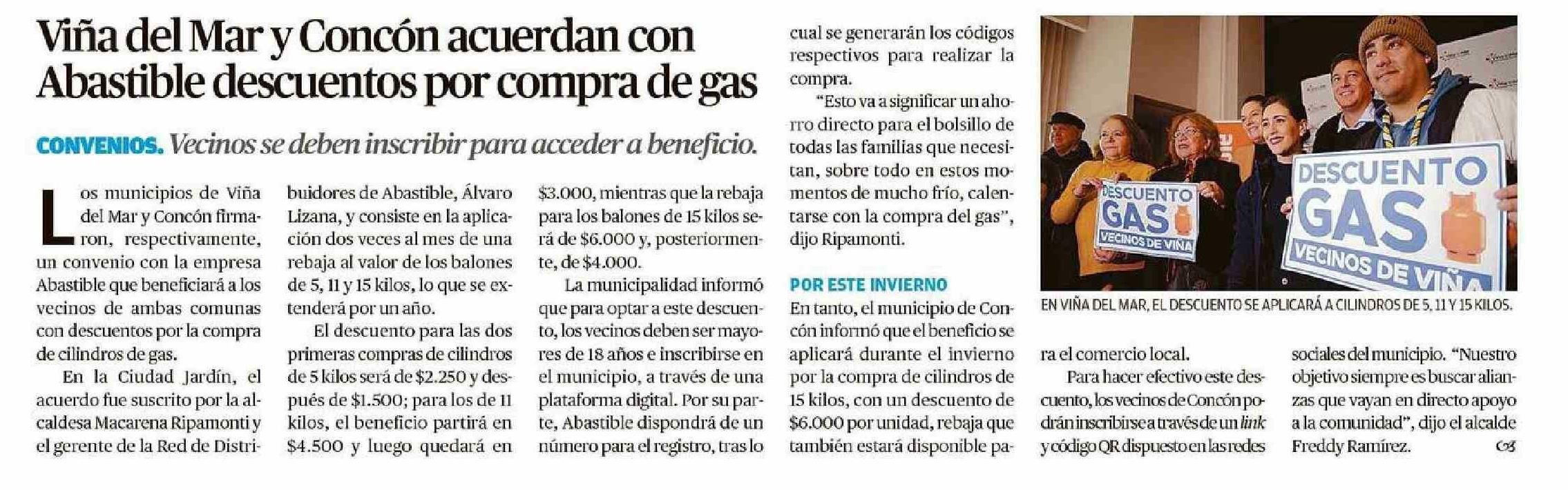 Viña del Mar y Concón acuerdan con Abastible descuentos por compra de gas 13-06-2024 El Mercurio de Valparaíso |