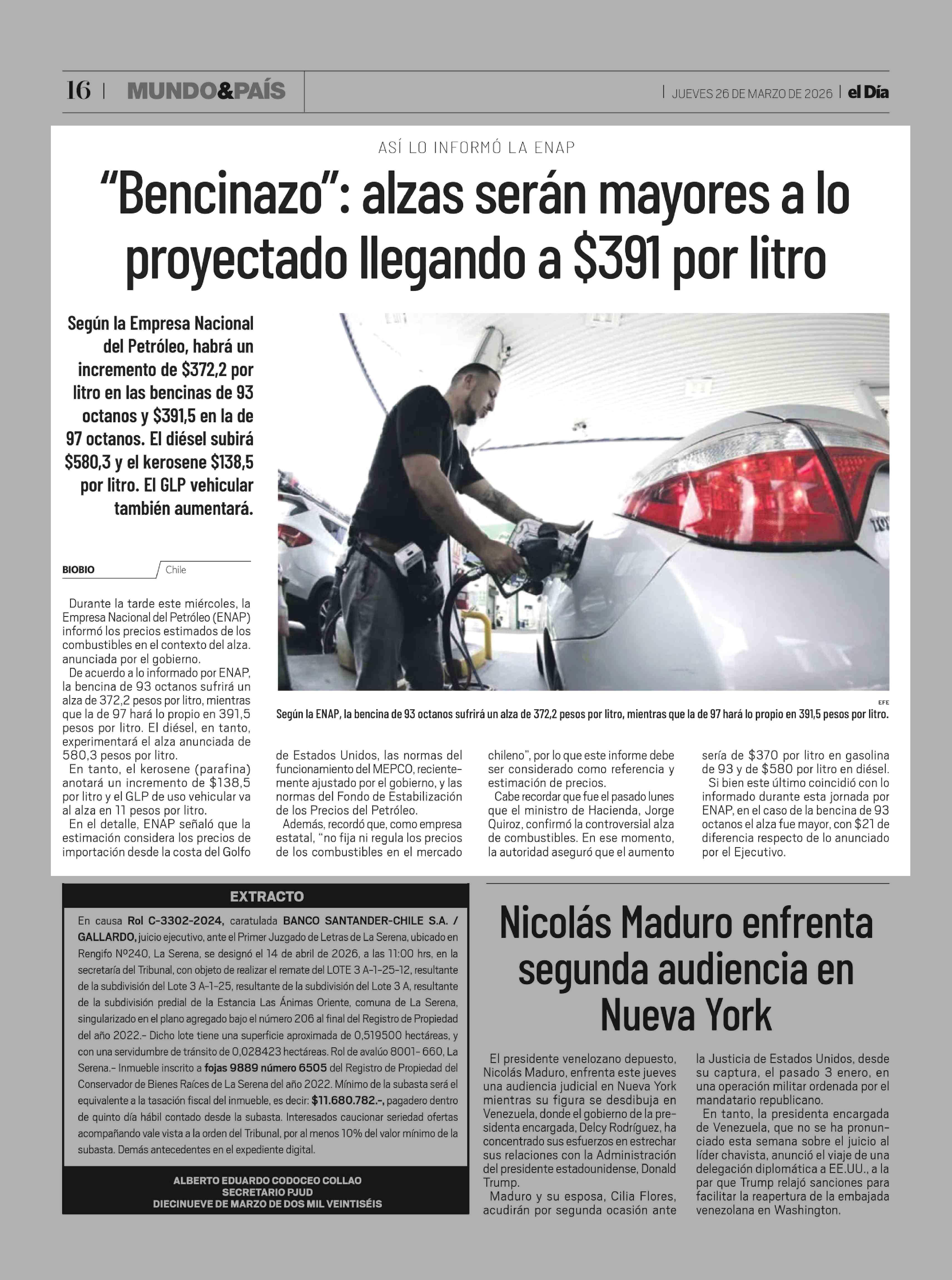 "Bencinazo": alzas serán mayores a lo proyectado llegando a $391 por litro 26-03-2026 El Día |