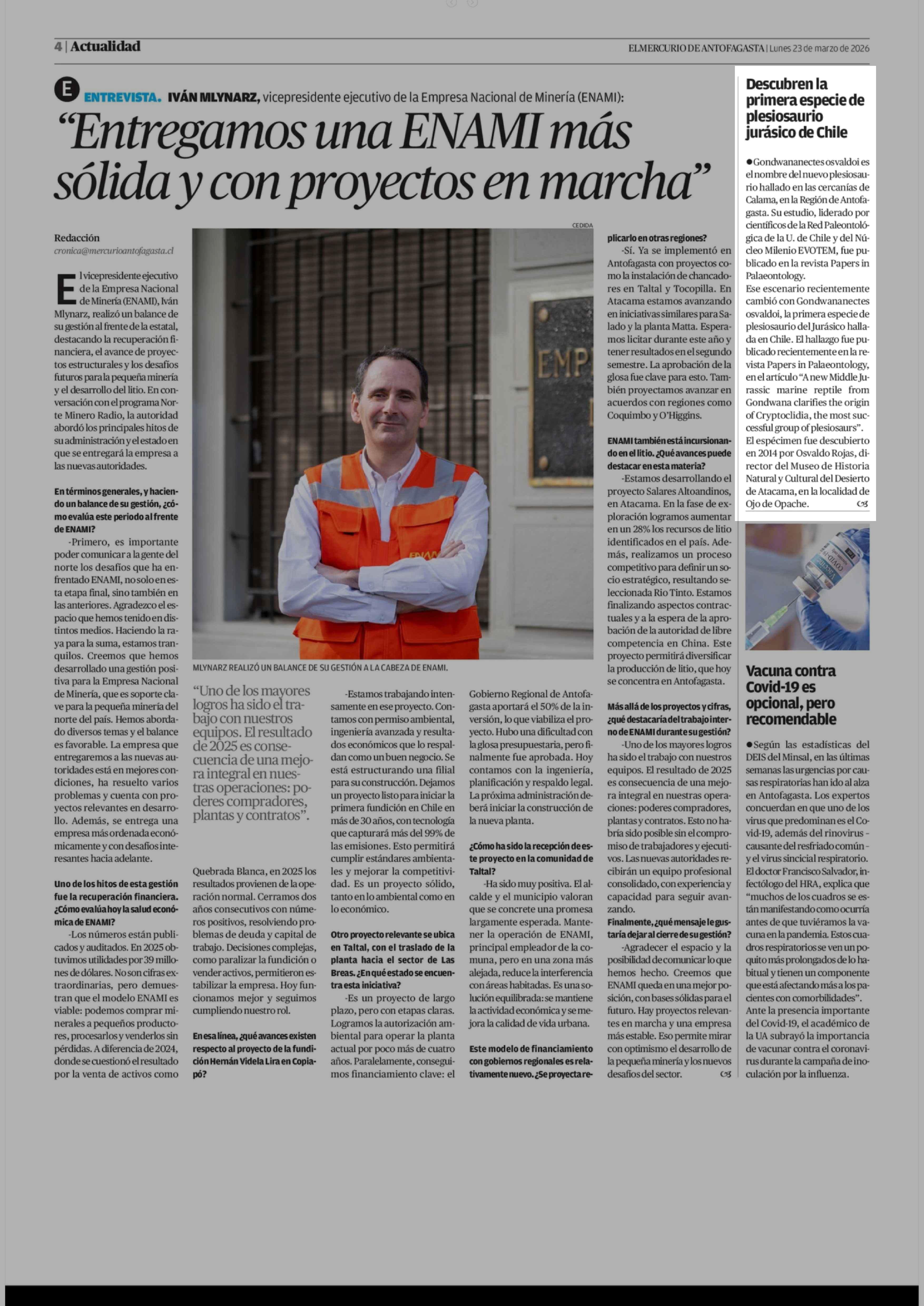 Descubren la primera especie de plesiosaurio jurásico de Chile 23-03-2026 El Mercurio de Antofagasta |