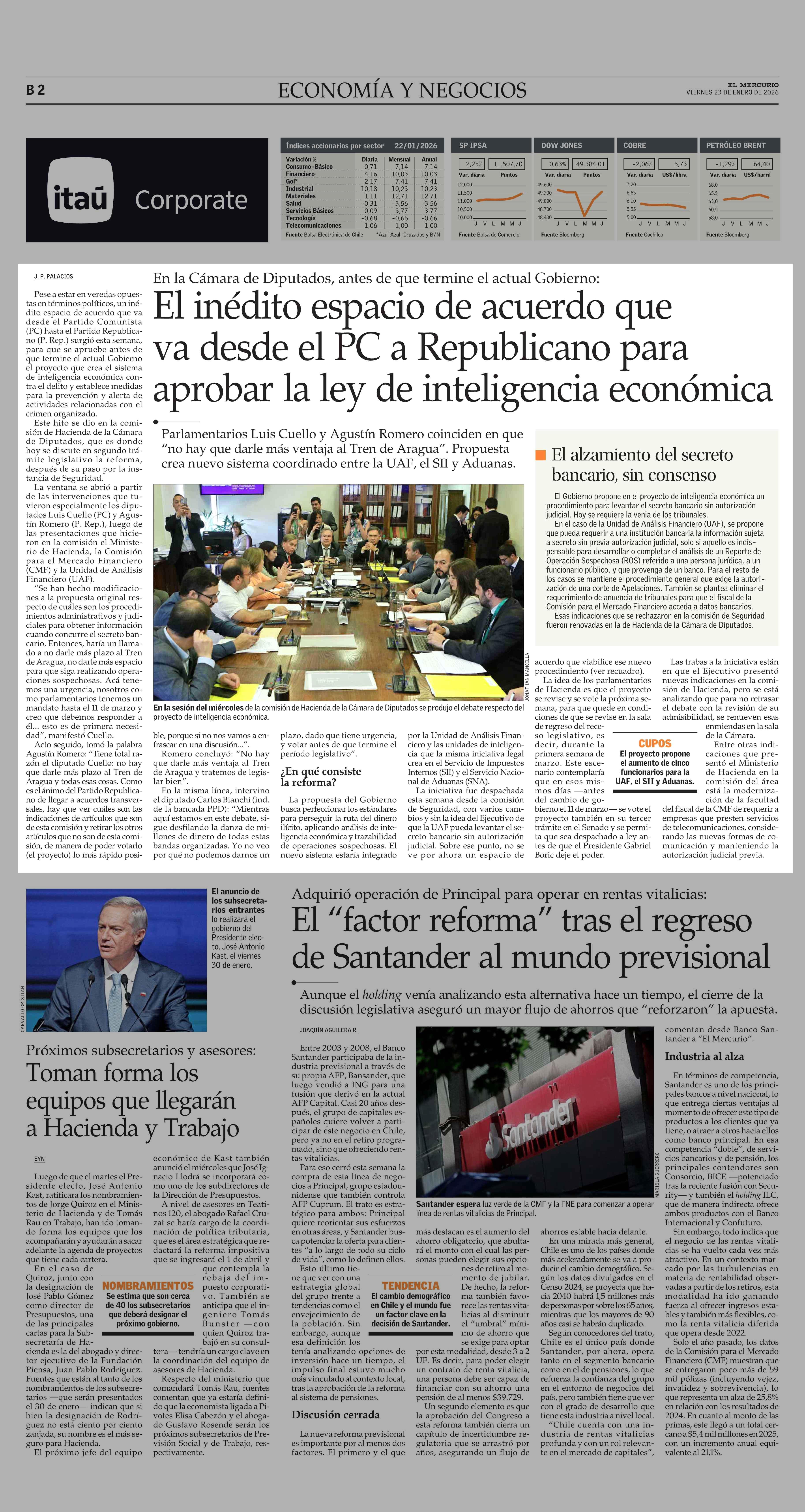 El inédito espacio de acuerdo que va desde el PC a Republicano para aprobar la ley de inteligencia económica 23-01-2026 El Mercurio |