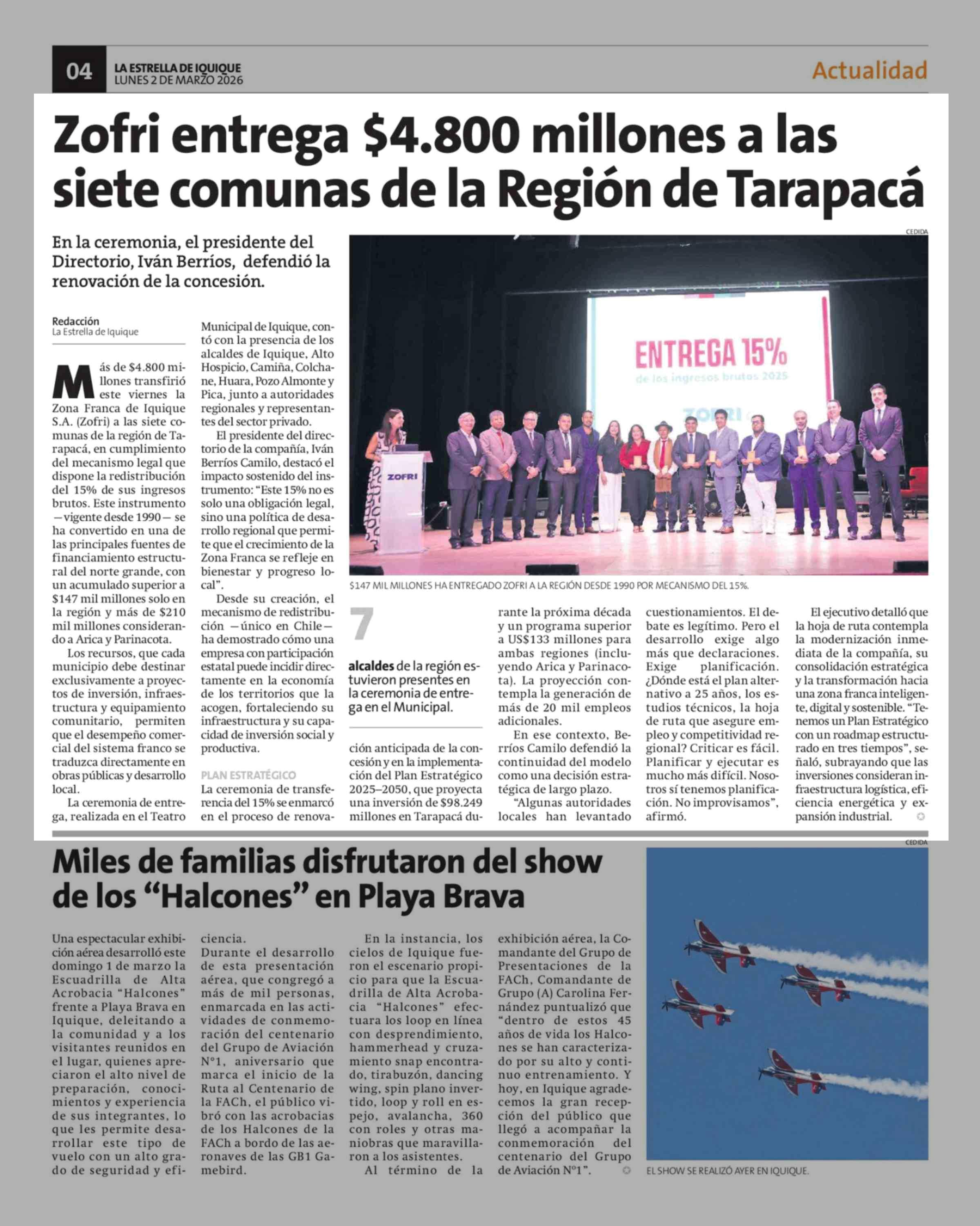 Zofri entrega $4.800 millones a las siete comunas de la Región de Tarapacá 02-03-2026 La Estrella de Iquique |