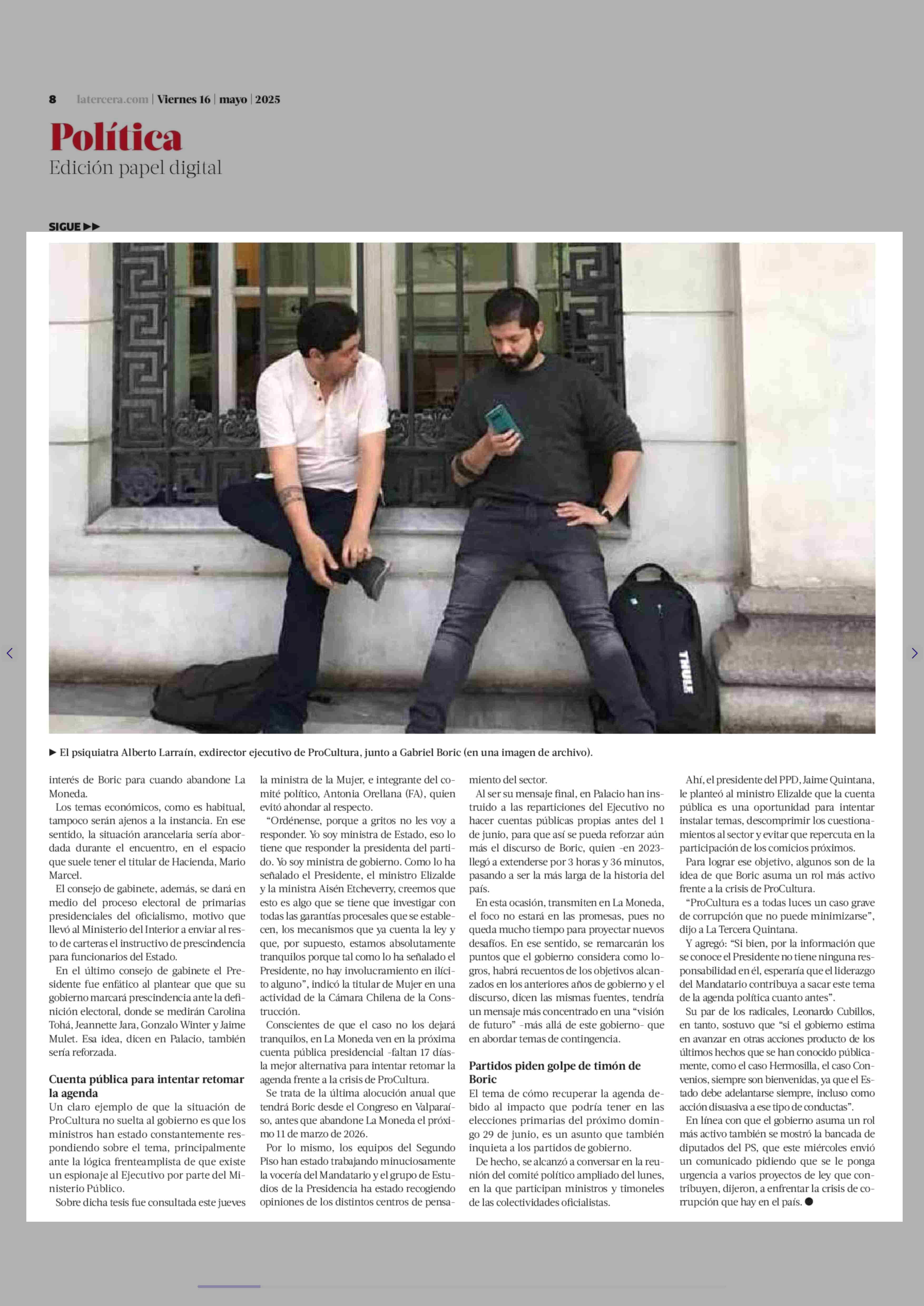 Boric encabezará consejo de gabinete con miras a su última cuenta pública en medio del caso ProCultura 16-05-2025 La Tercera |