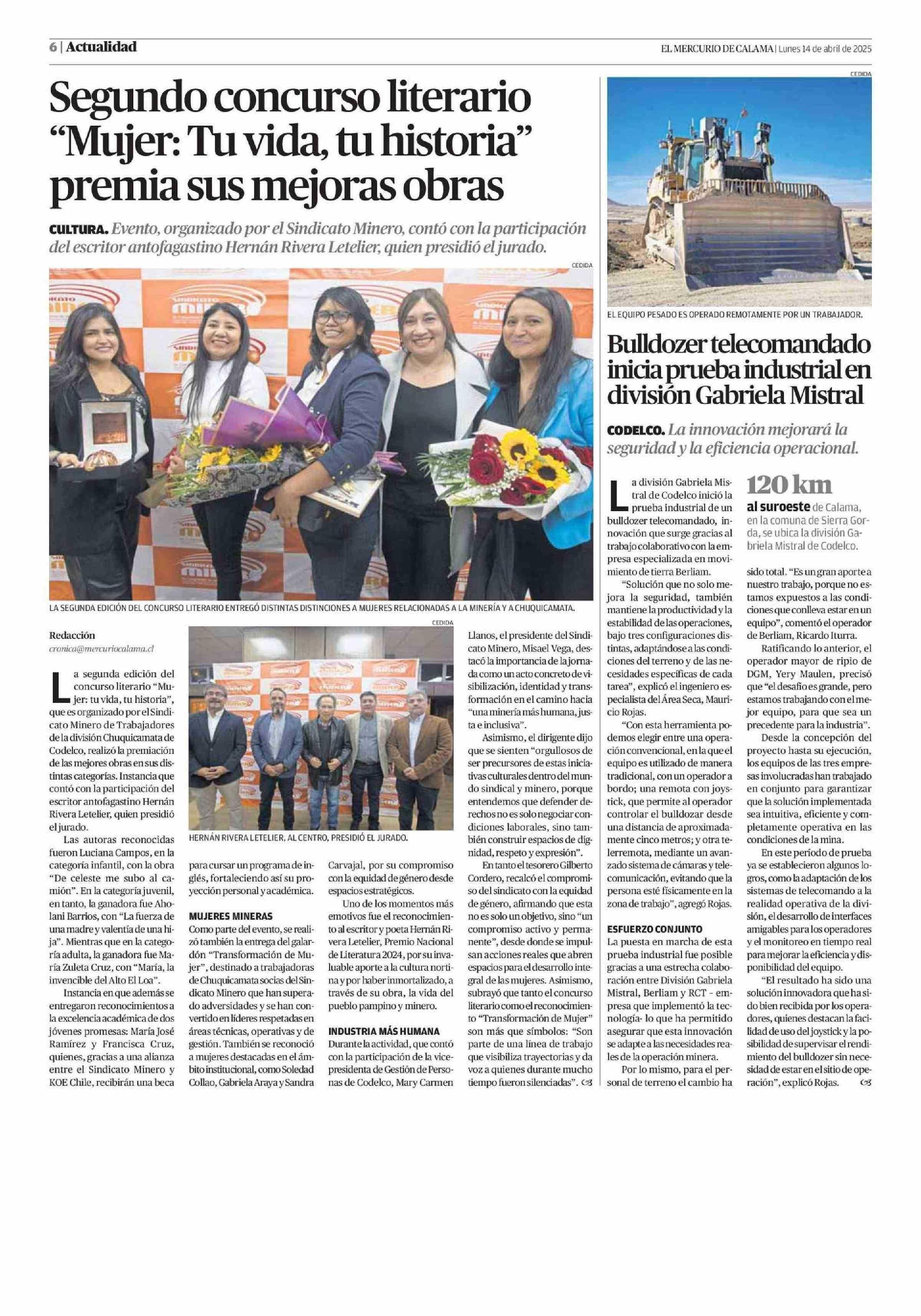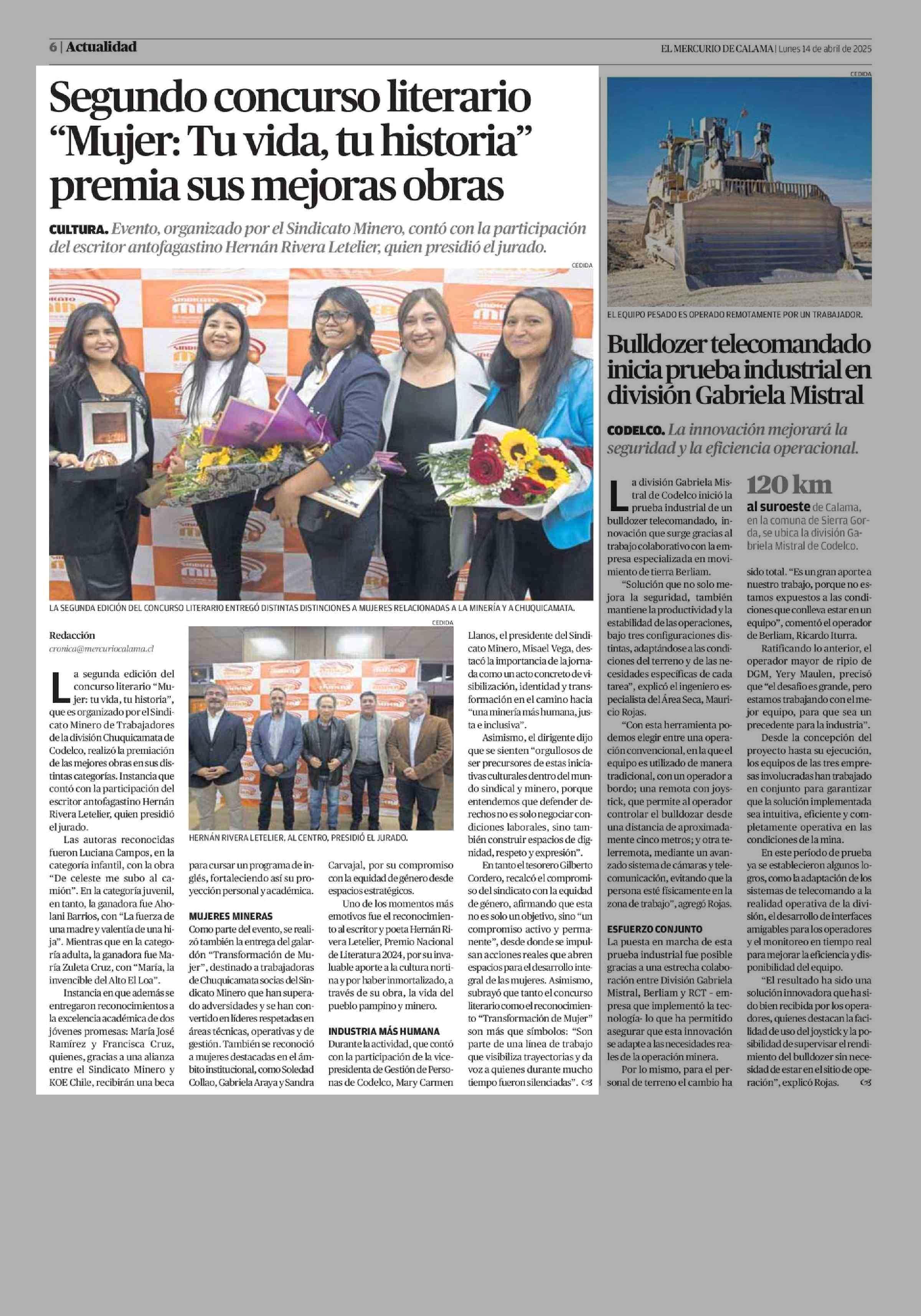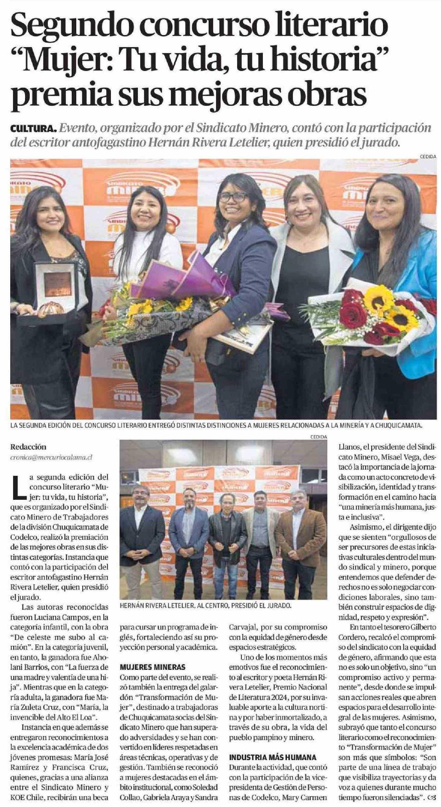 Segundo concurso literario "Mujer: Tu vida, tu historia" 14-04-2025 El Mercurio de Calama |