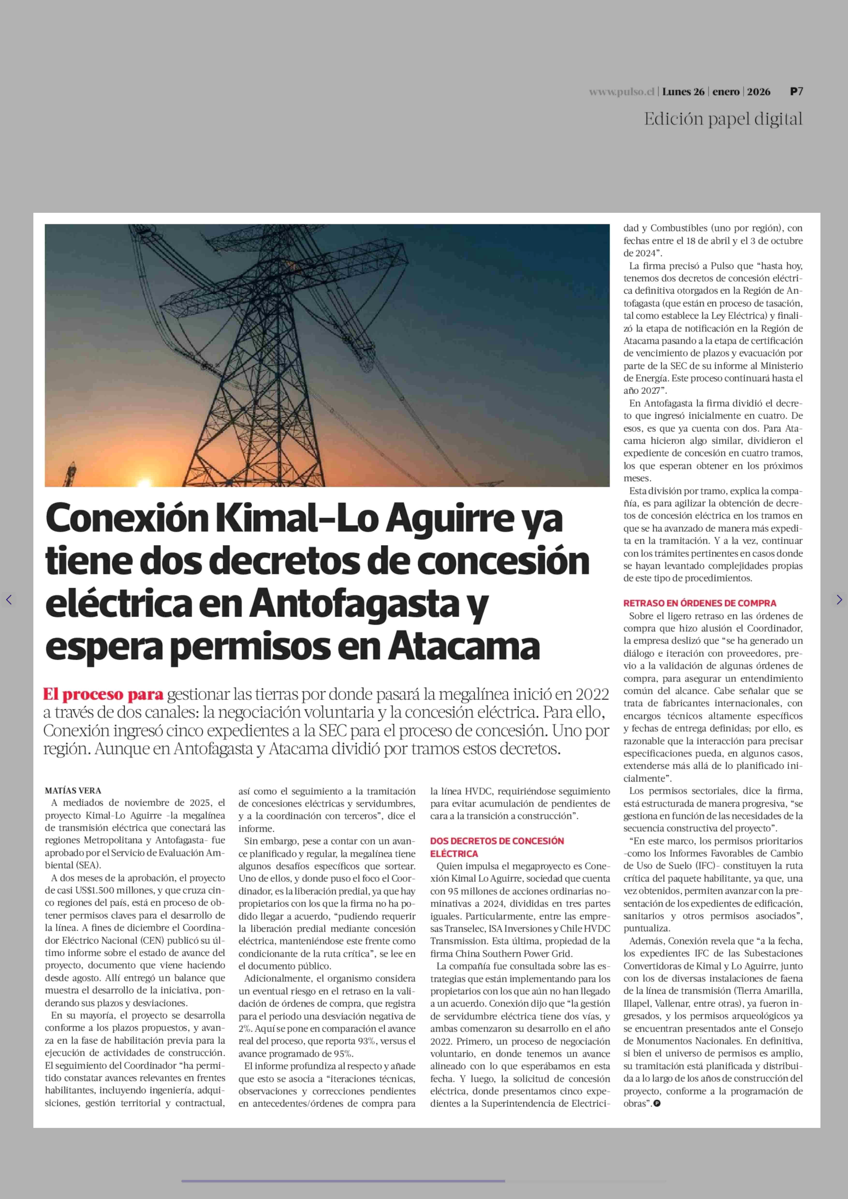 Título: Conexión Kimal-Lo Aguirre ya tiene dos decretos de concesión eléctrica en Antofagasta y espera permisos en Atacama