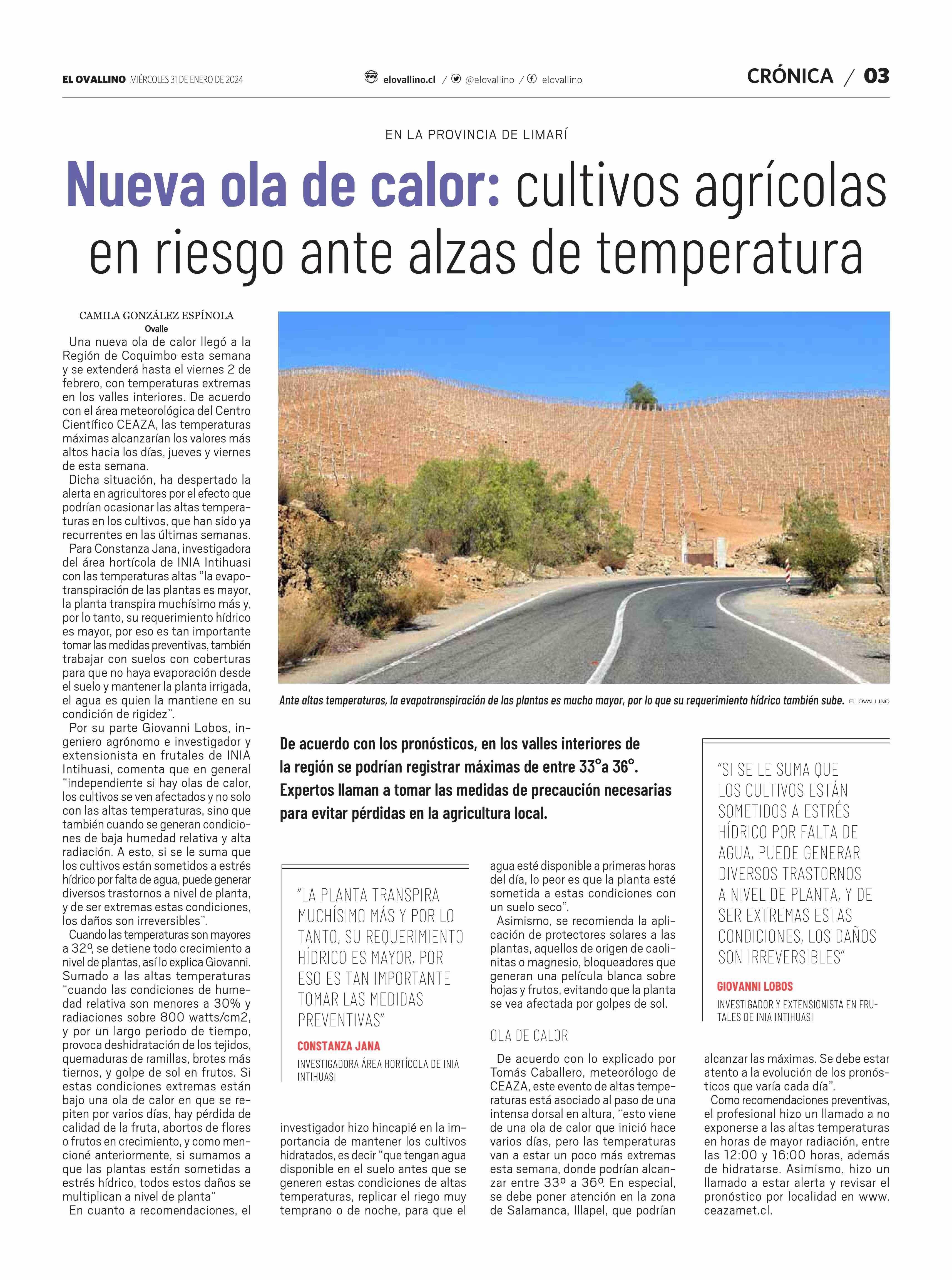 Nueva ola de calor: cultivos agrícolas en riesgo ante alzas de temperatura 31-01-2024 El Ovallino |