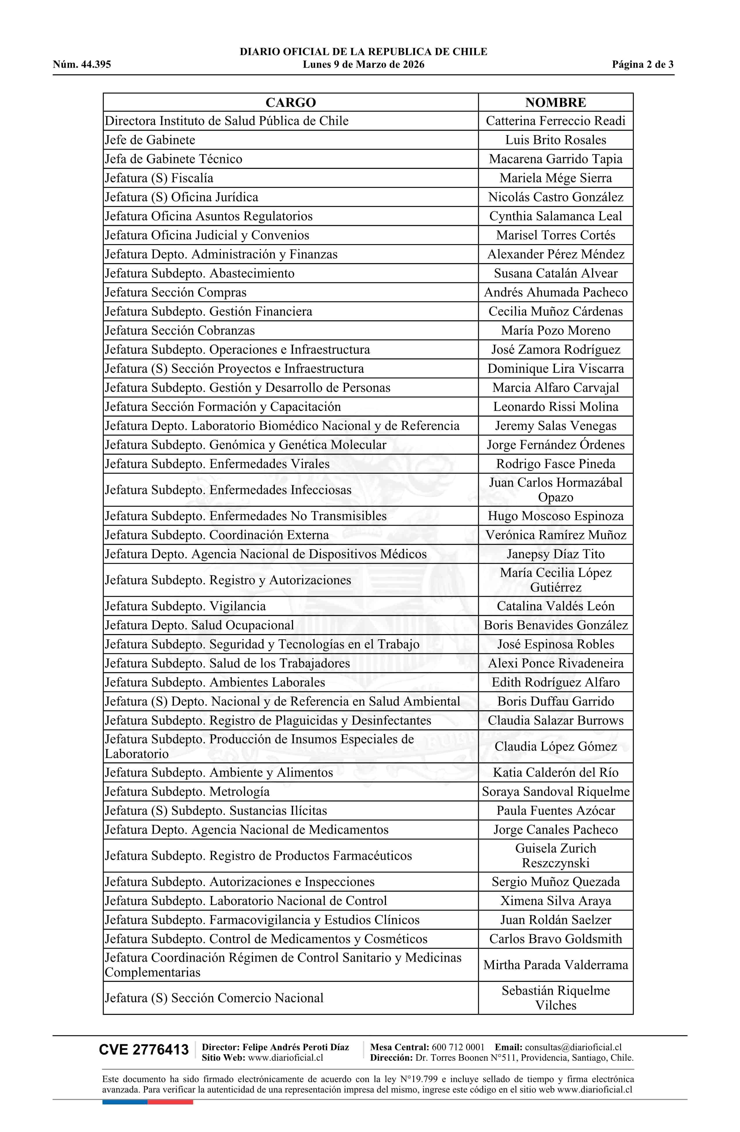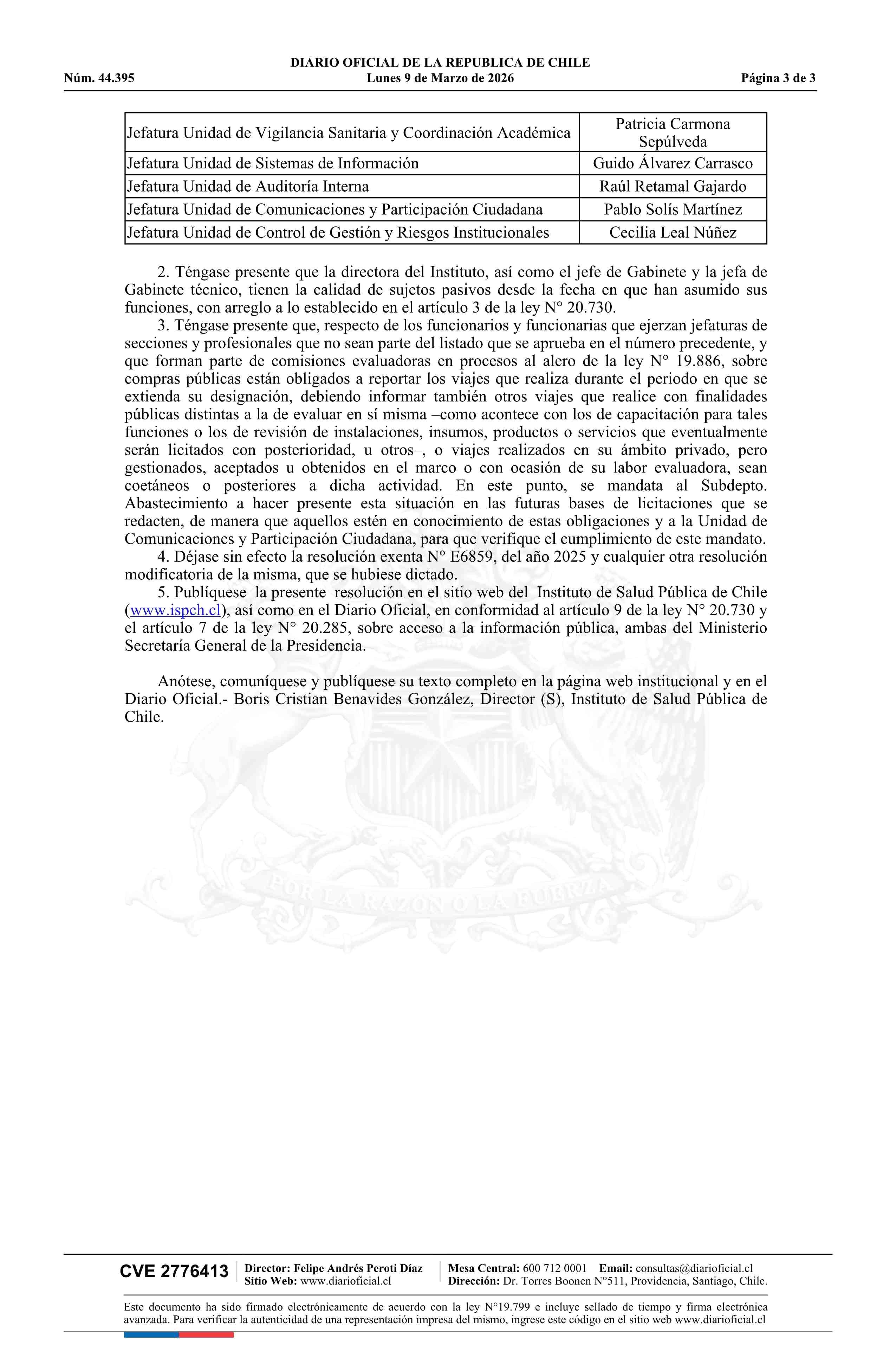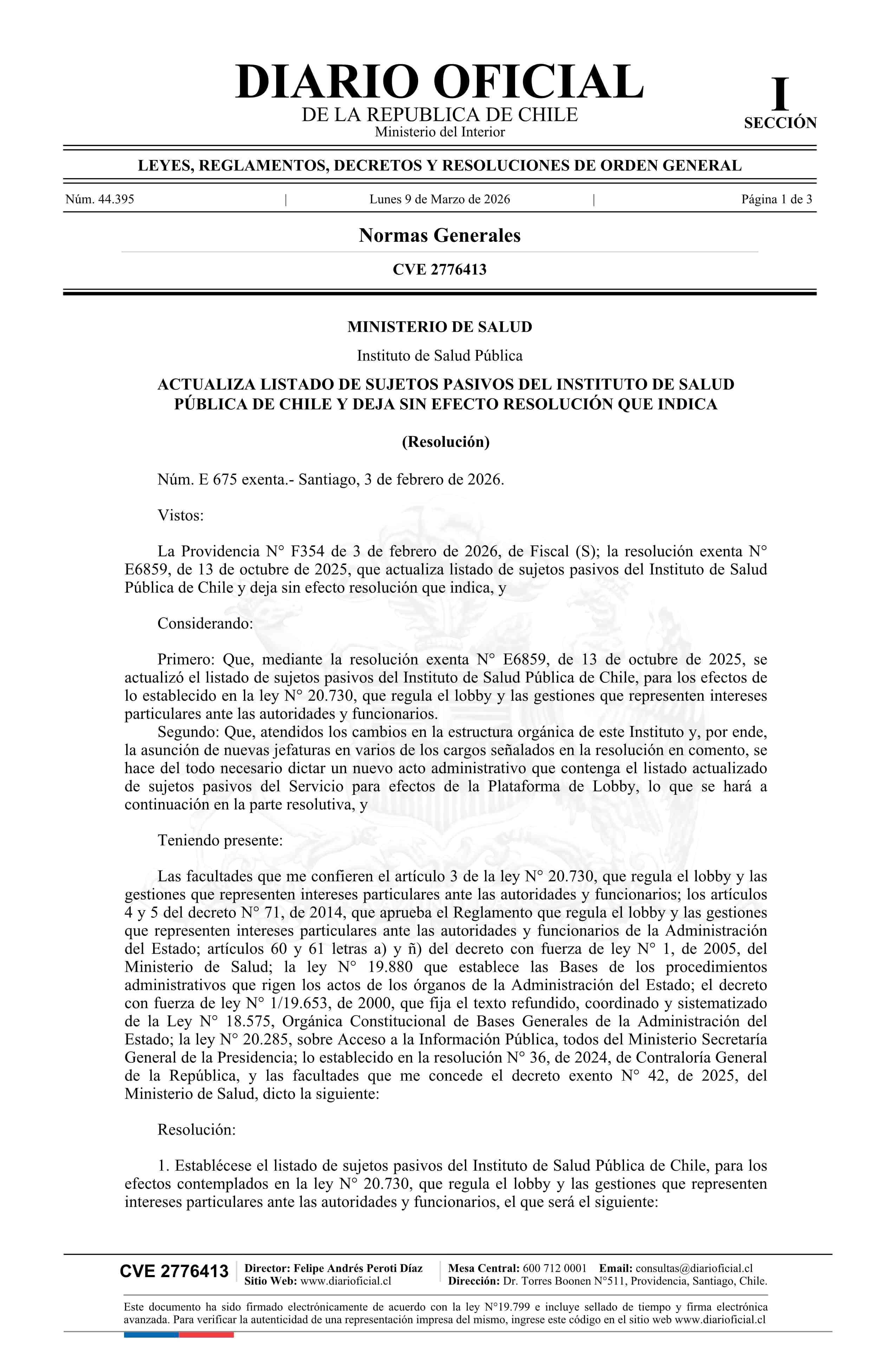 Resolución exenta número E 675, de 2026.- Actualiza listado de sujetos pasivos del Instituto de Salud Pública de Chile y deja sin efecto resolución N° E6859 exenta de 2025 09-03-2026 Diario Oficial Edición Electrónica |