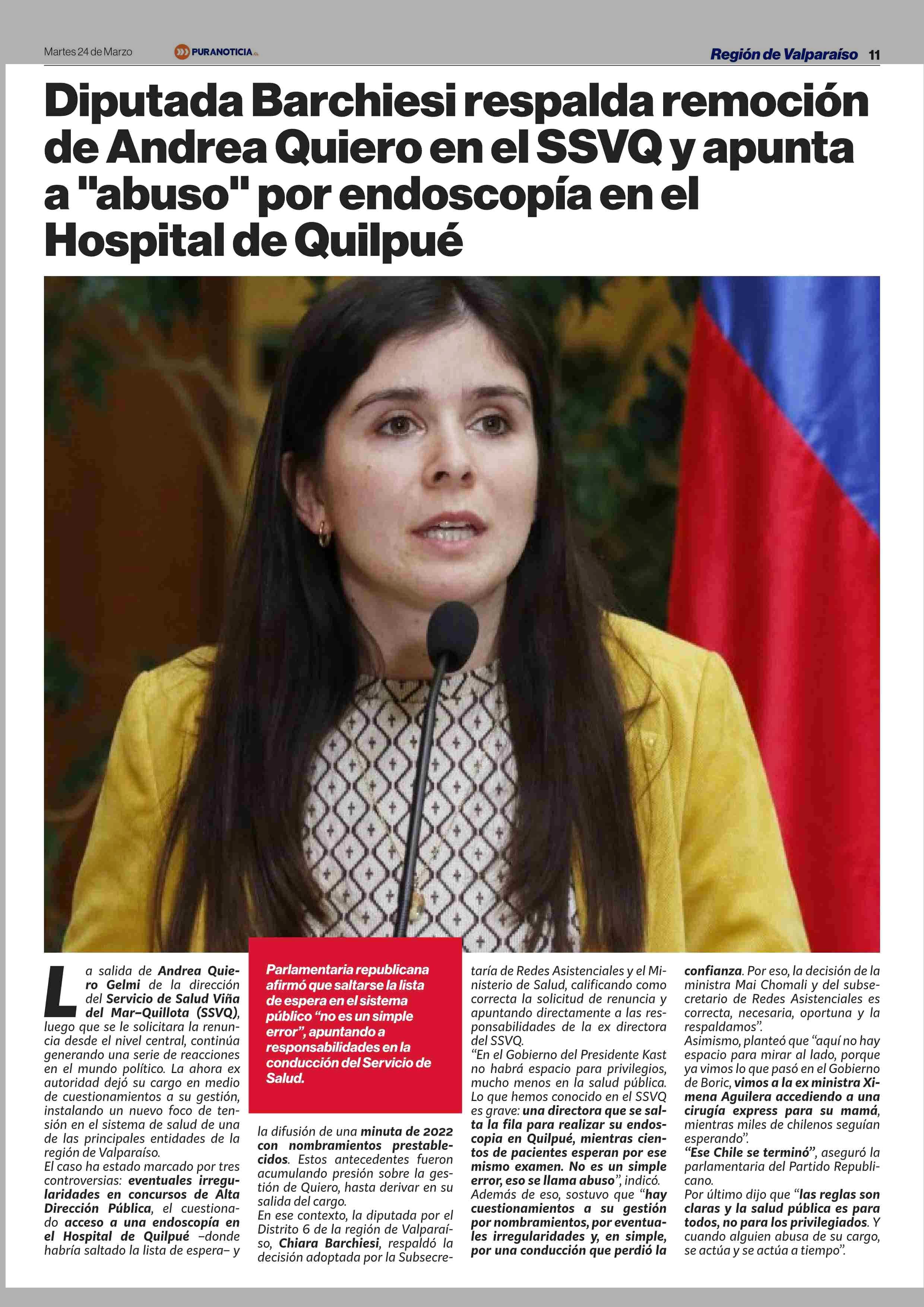 Título: Diputada Barchiesi respalda remoción de Andrea Quiero en el SSVQ y apunta a"abuso” por endoscopía en el Hospital de Quilpué