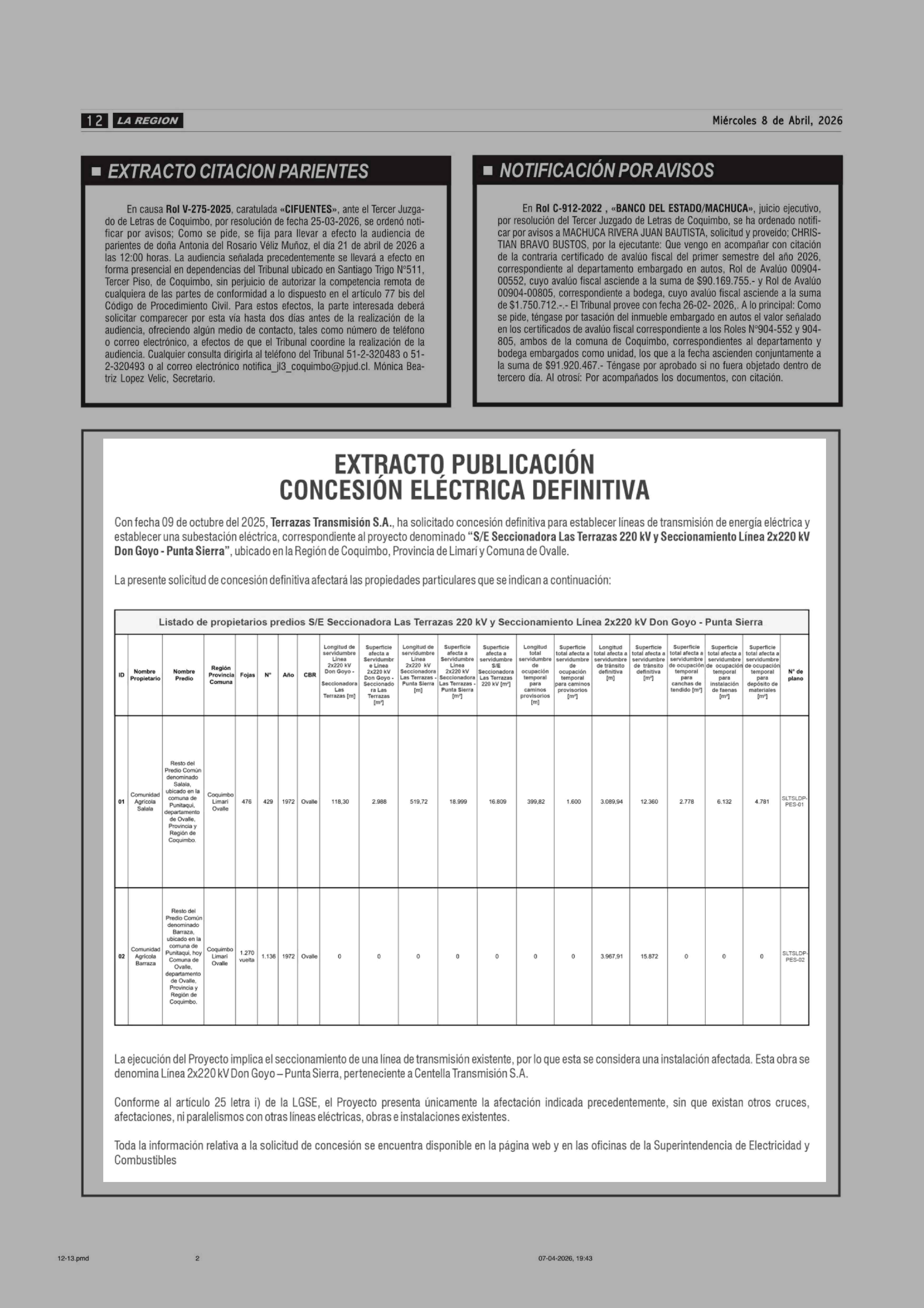 EXTRACTO PUBLICACIÓN CONCESIÓN ELÉCTRICA DEFINITIVA 08-04-2026 Diario la Región |