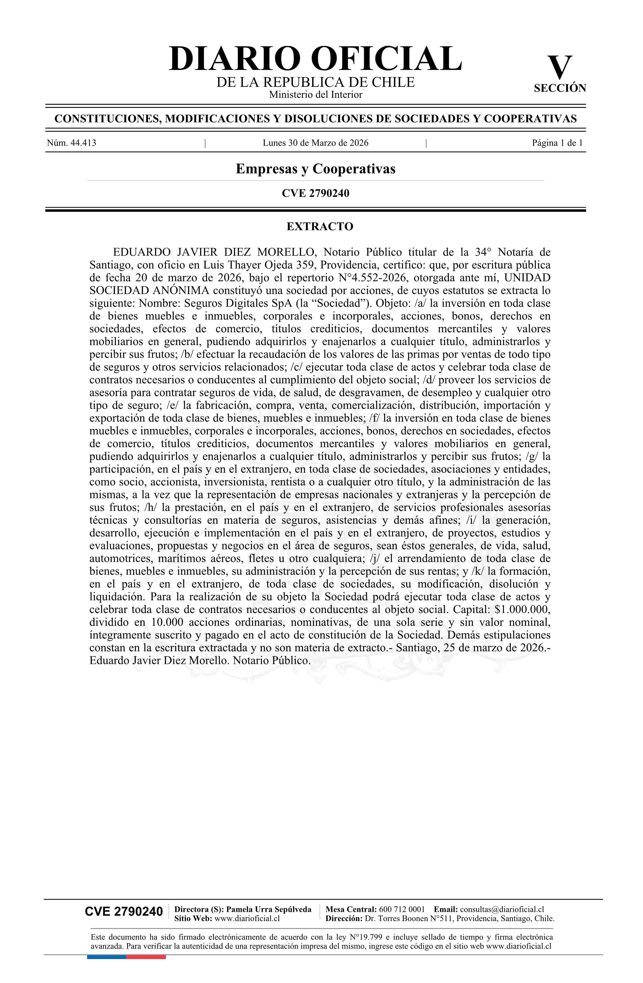 Seguros Digitales SpA 30-03-2026 Diario Oficial Edición Electrónica |