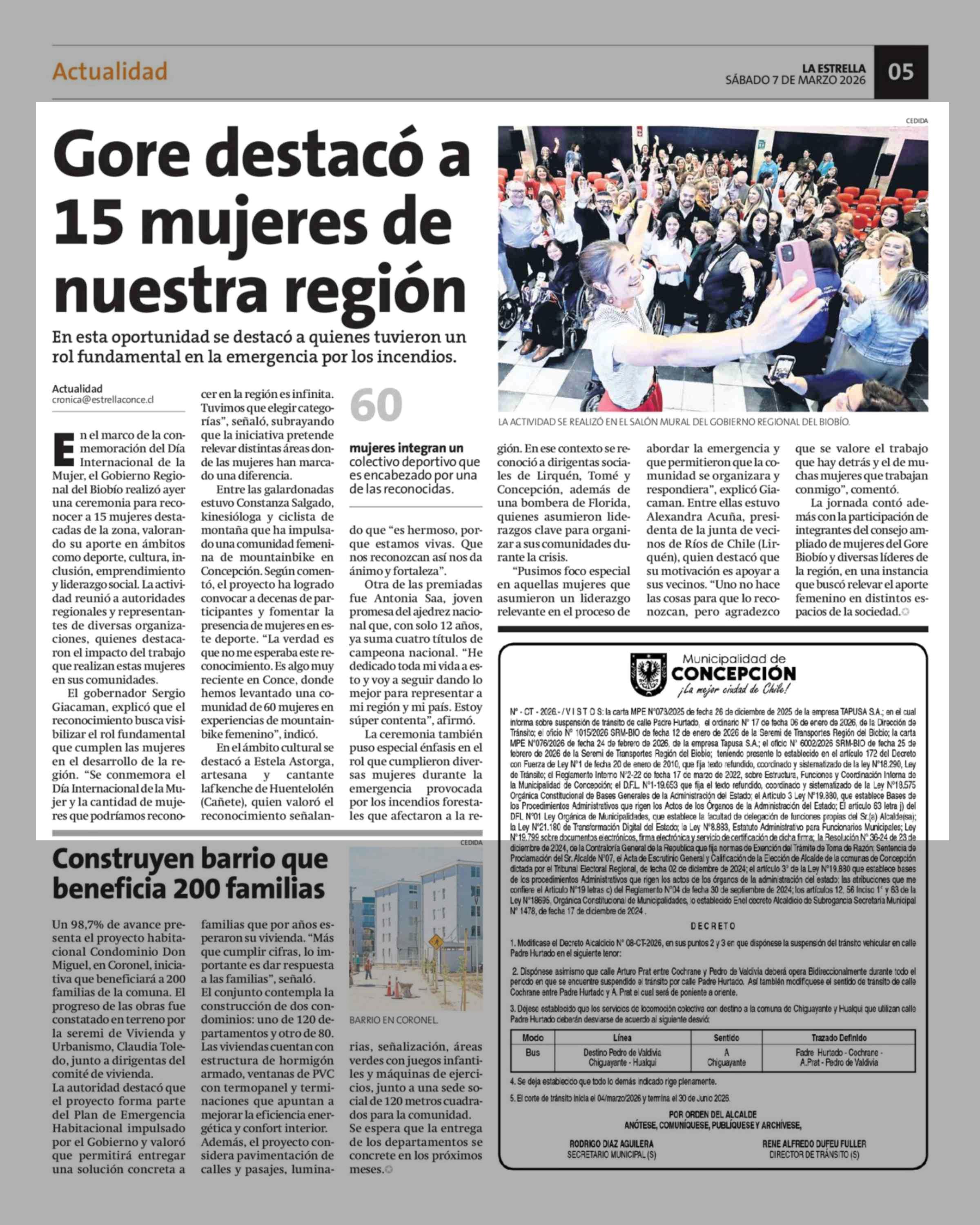 Gore destacó a 15 mujeres de nuestra región 07-03-2026 La Estrella de Concepción |