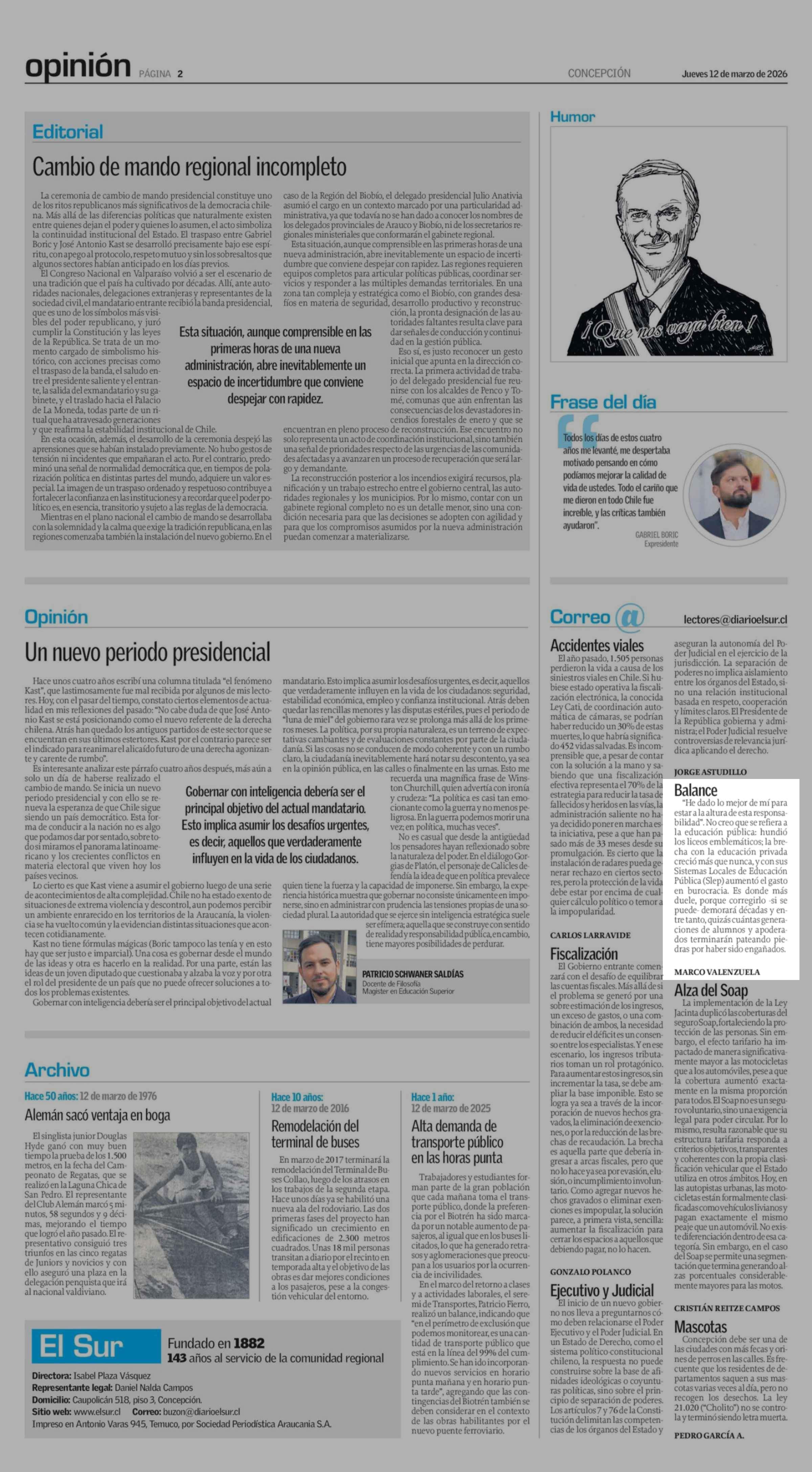 CARTAS: BALANCE 12-03-2026 El Sur |