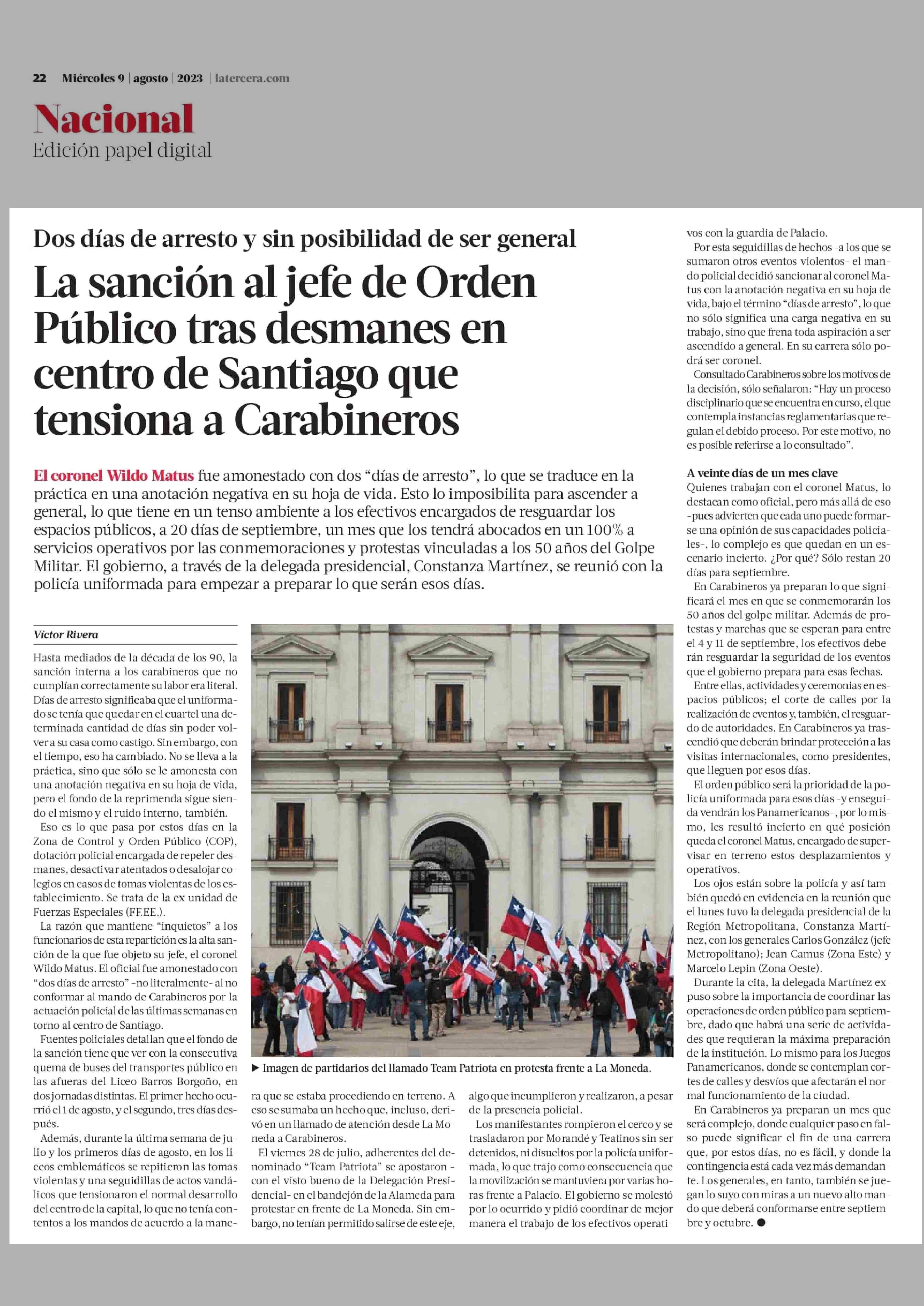La sanción al jefe de Orden Público tras desmanes en centro de Santiago que tensiona a Carabineros 09-08-2023 La Tercera |