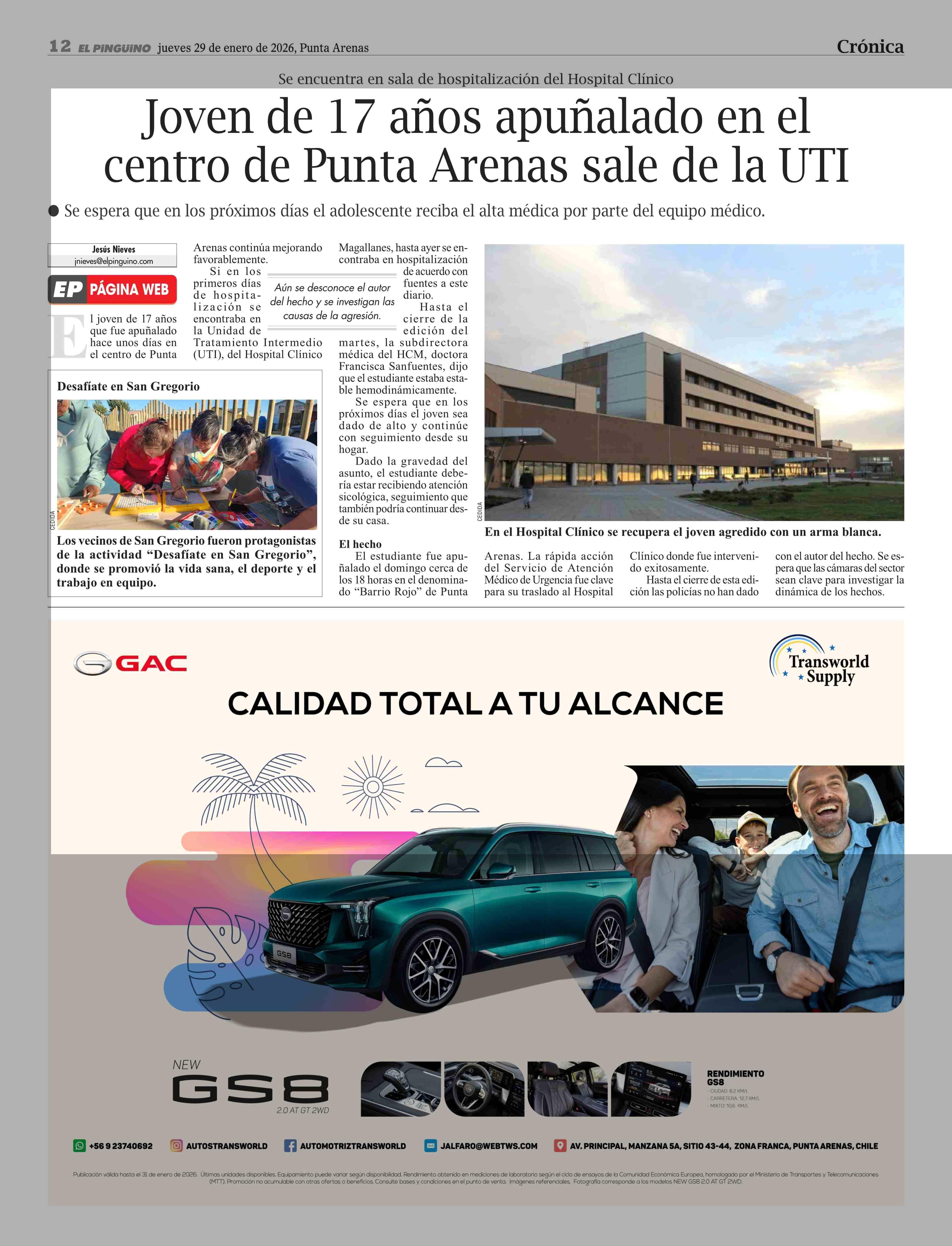 | Título: | Joven de 17 años apuñalado en el centro de Punta Arenas sale de la UTI |