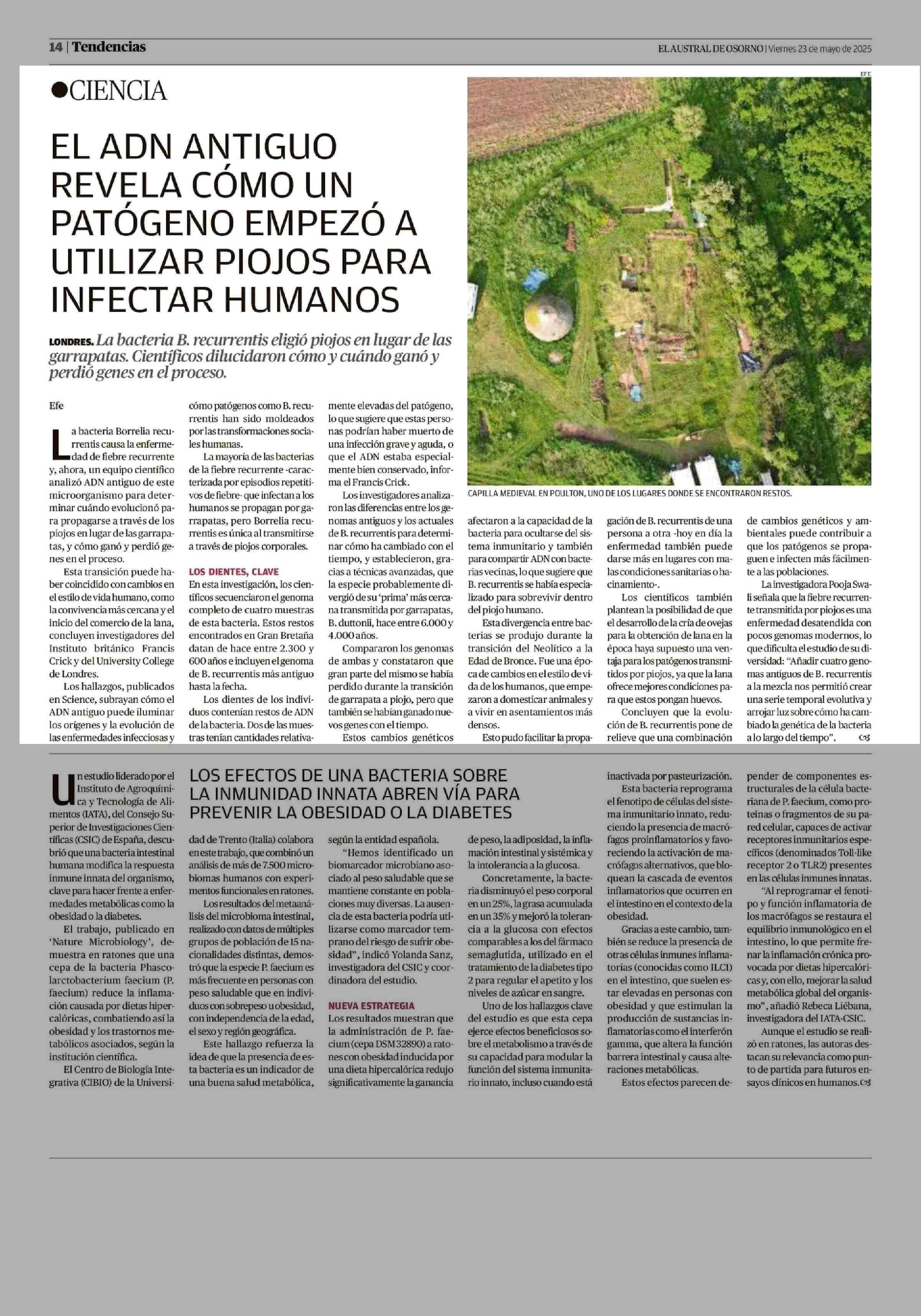 EL ADN ANTIGUO REVELA CÓMO UN | PATÓGENO EMPEZÓ A UTILIZAR PIOJOS PARA INFECTAR HUMANOS 23-05-2025 El Austral de Osorno |