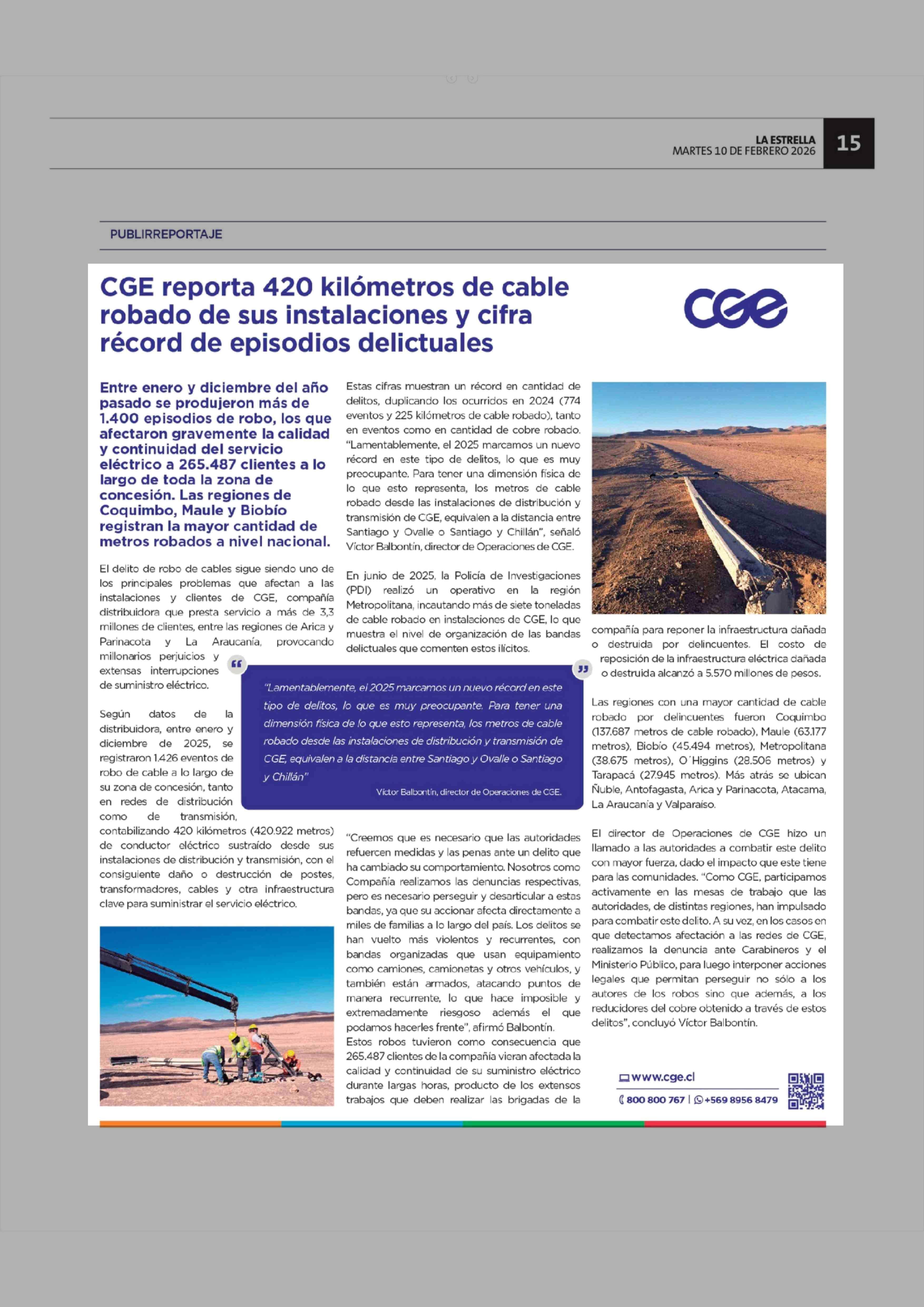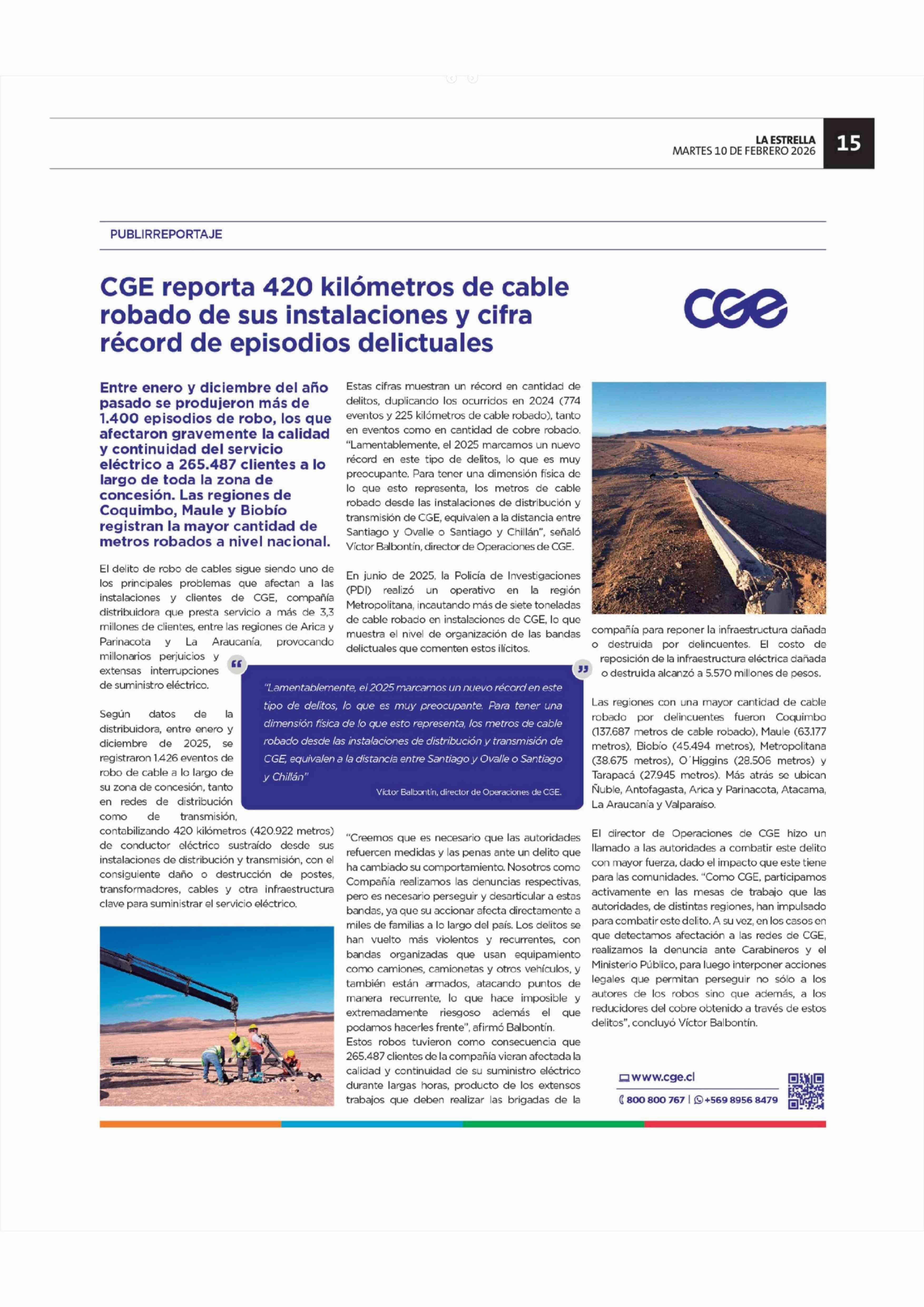 Título: CGE reporta 420 kilómetros de cable robado de sus instalaciones y cifra récord de episodios delictuales