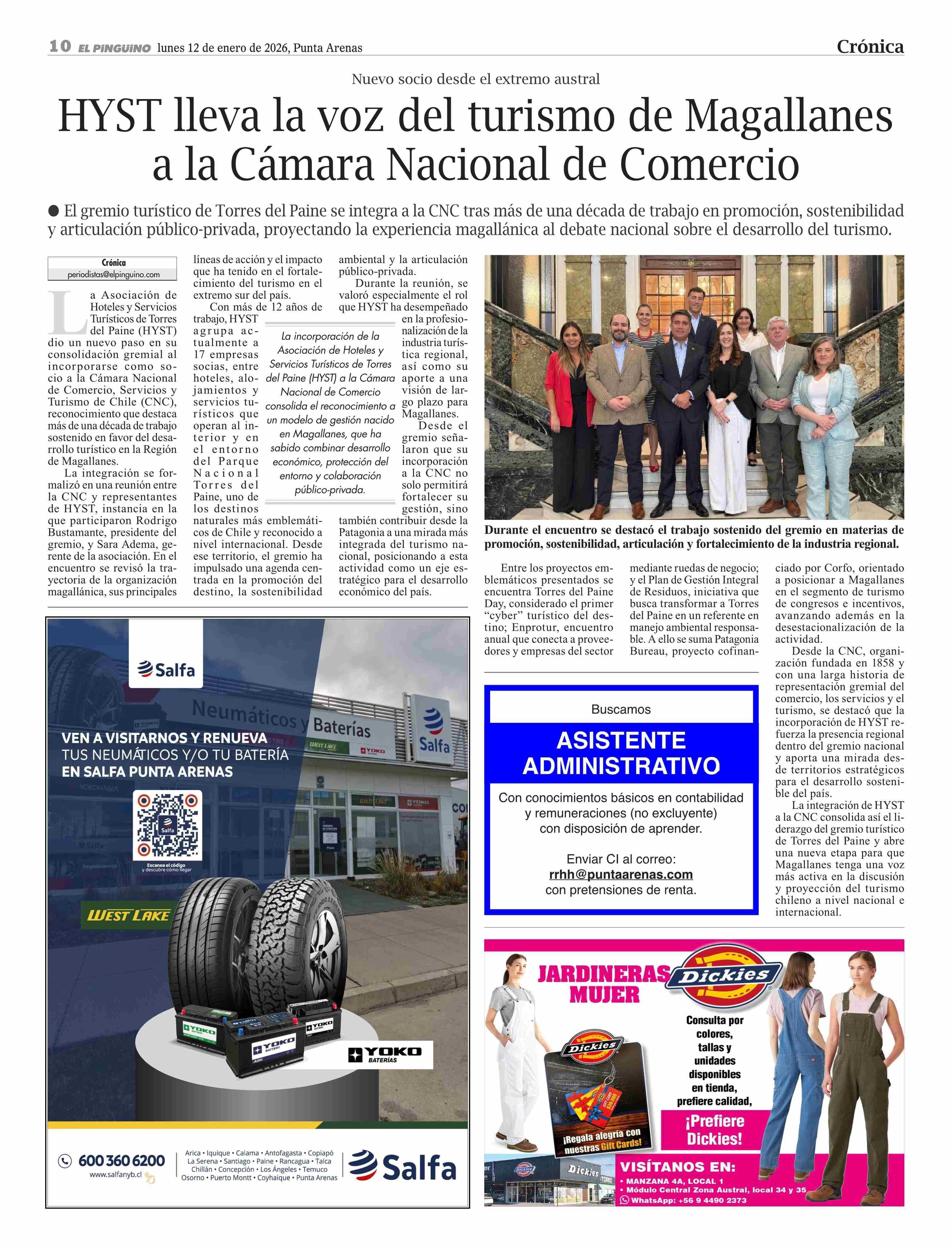 HYST lleva la voz del turismo de Magallanes a la Cámara Nacional de Comercio 12-01-2026 El Pingüino |