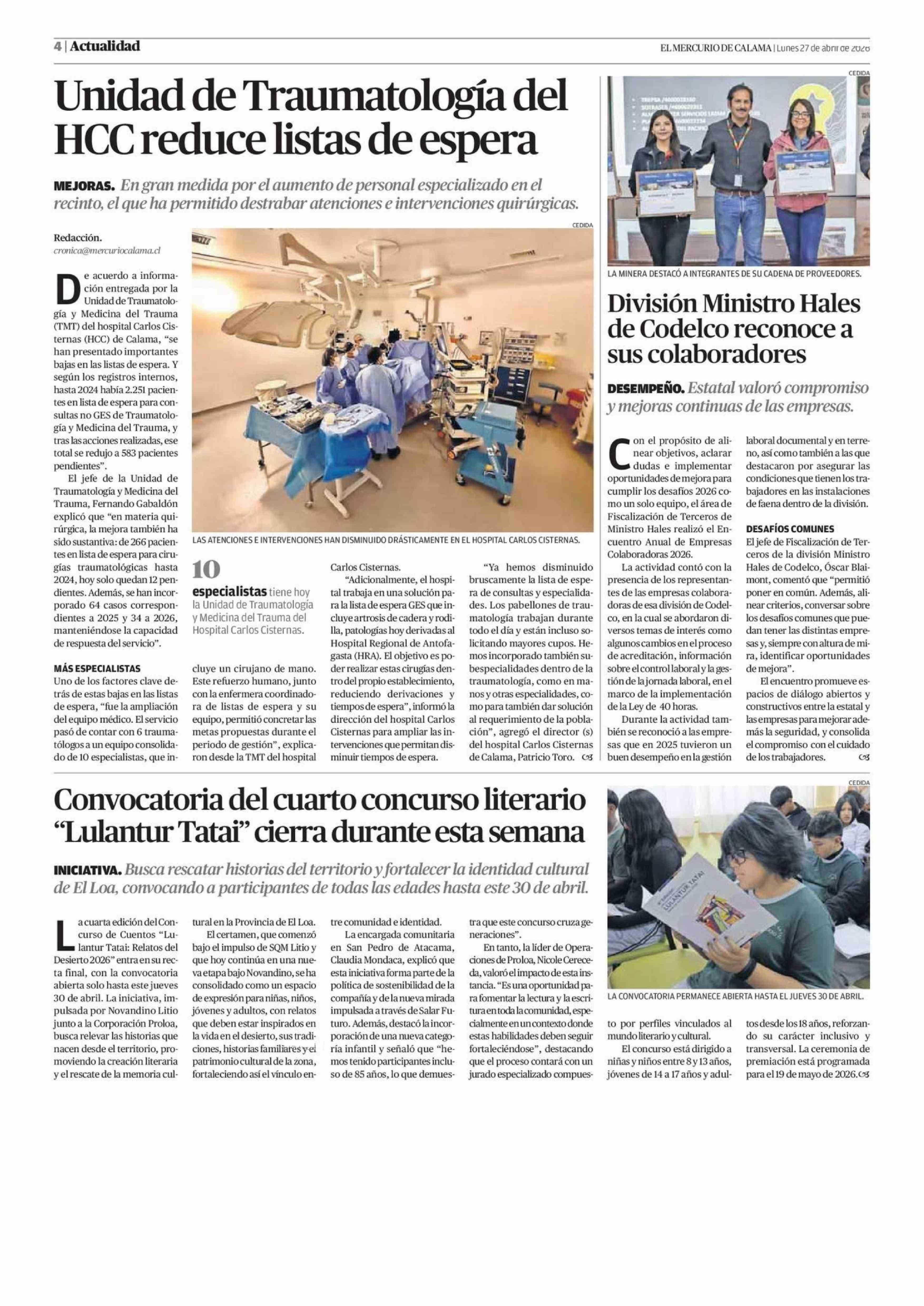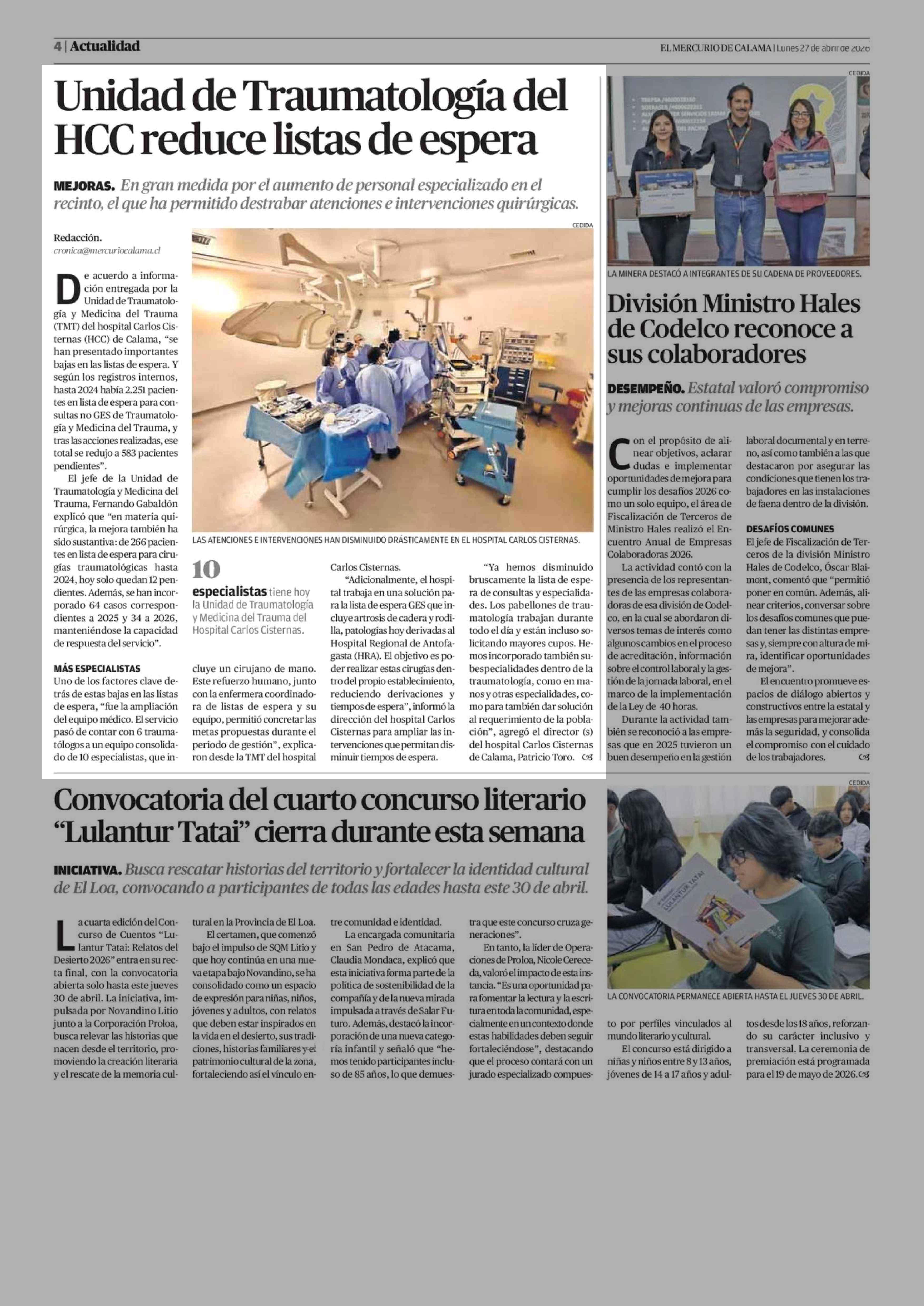 Unidad de Traumatología del HCC reduce listas de espera 27-04-2026 El Mercurio de Calama |