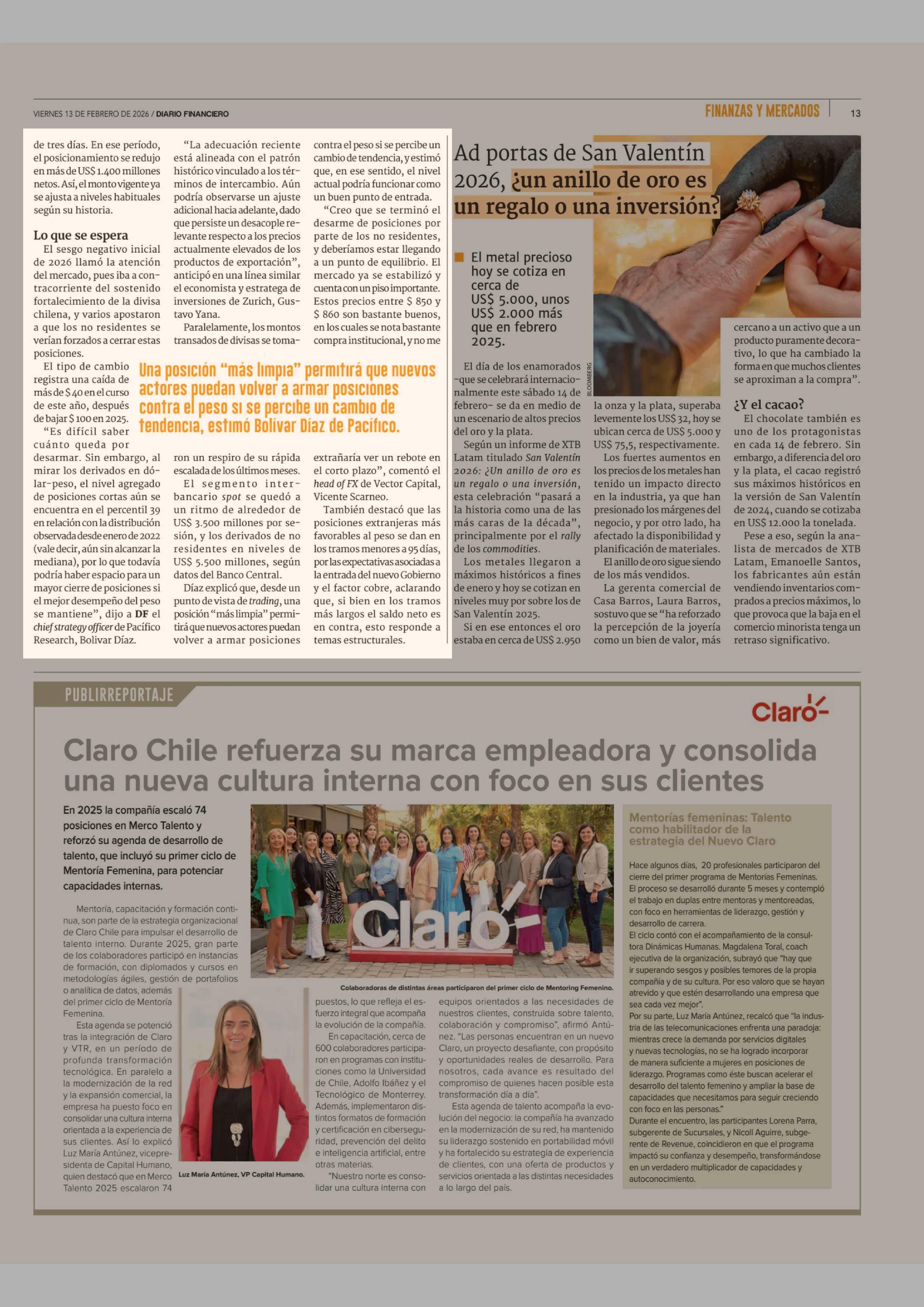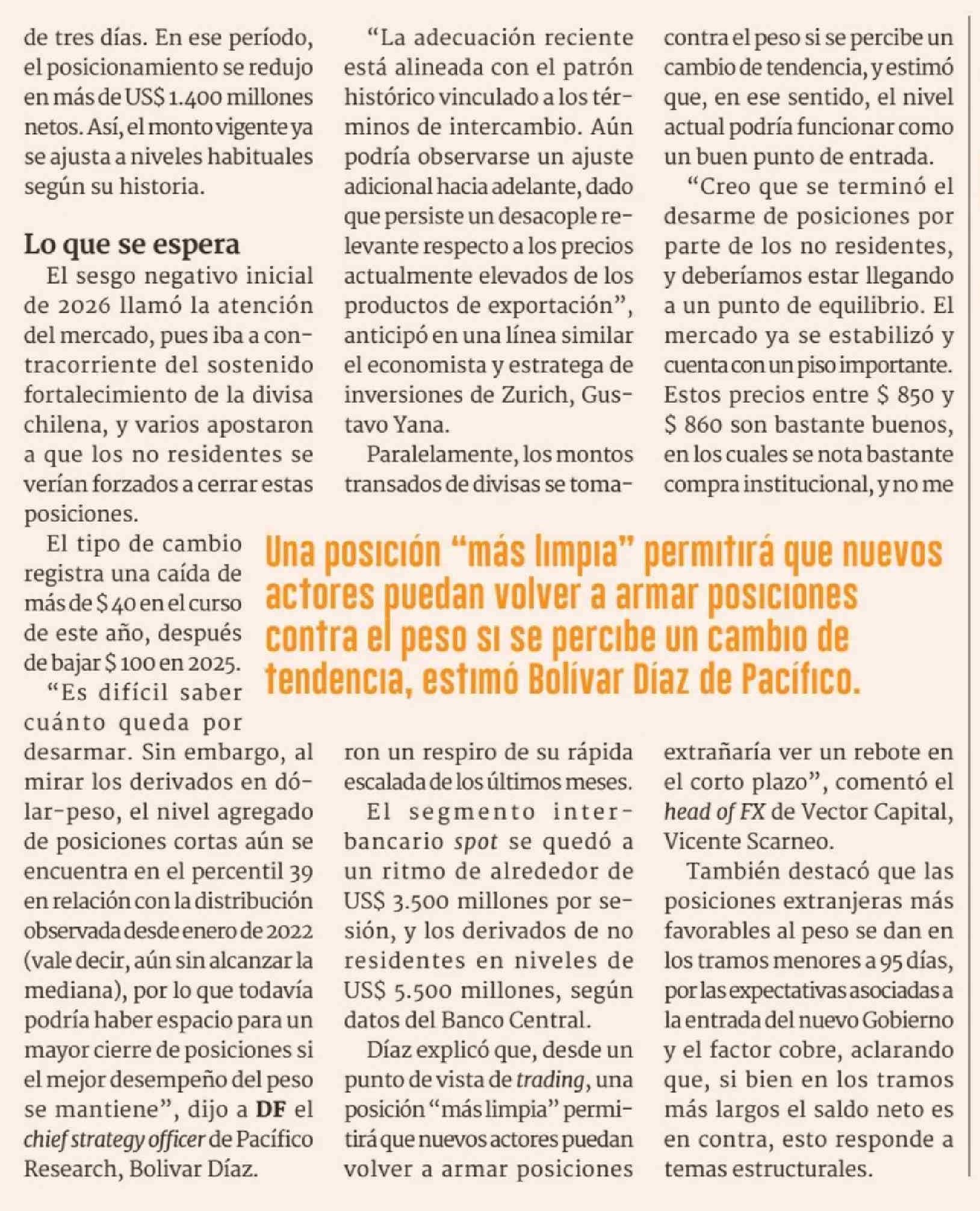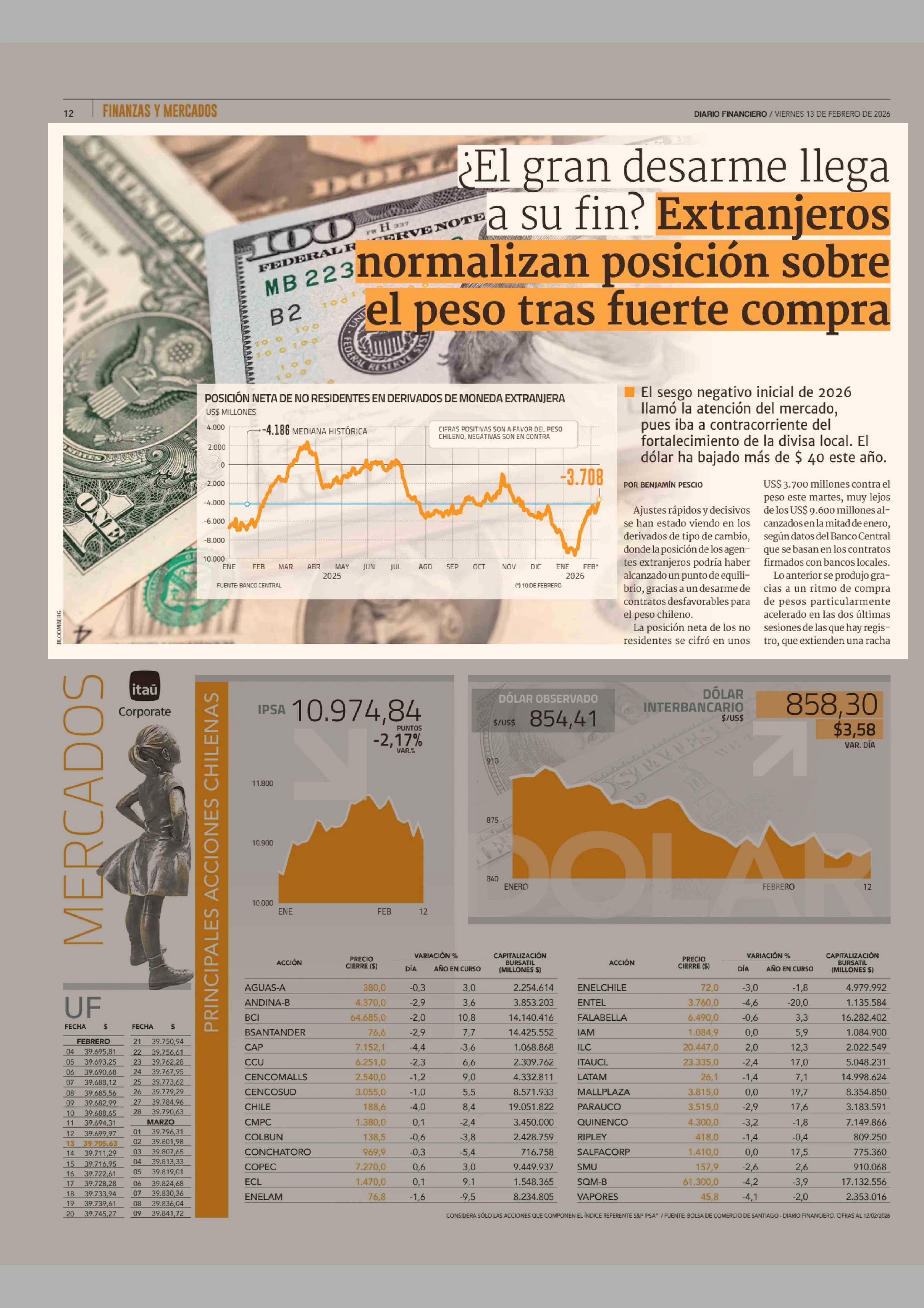 ¿El gran desarme llega a su fin? Extranjeros normalizan posición sobre el peso tras fuerte compra 13-02-2026 Diario Financiero |