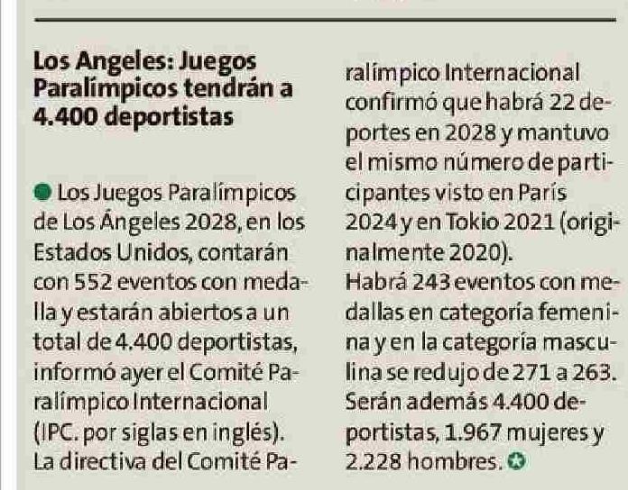 Los Angeles: Juegos Paralímpicos tendrán a 4.400 deportistas 04-06-2025 La Estrella de Chiloé |
