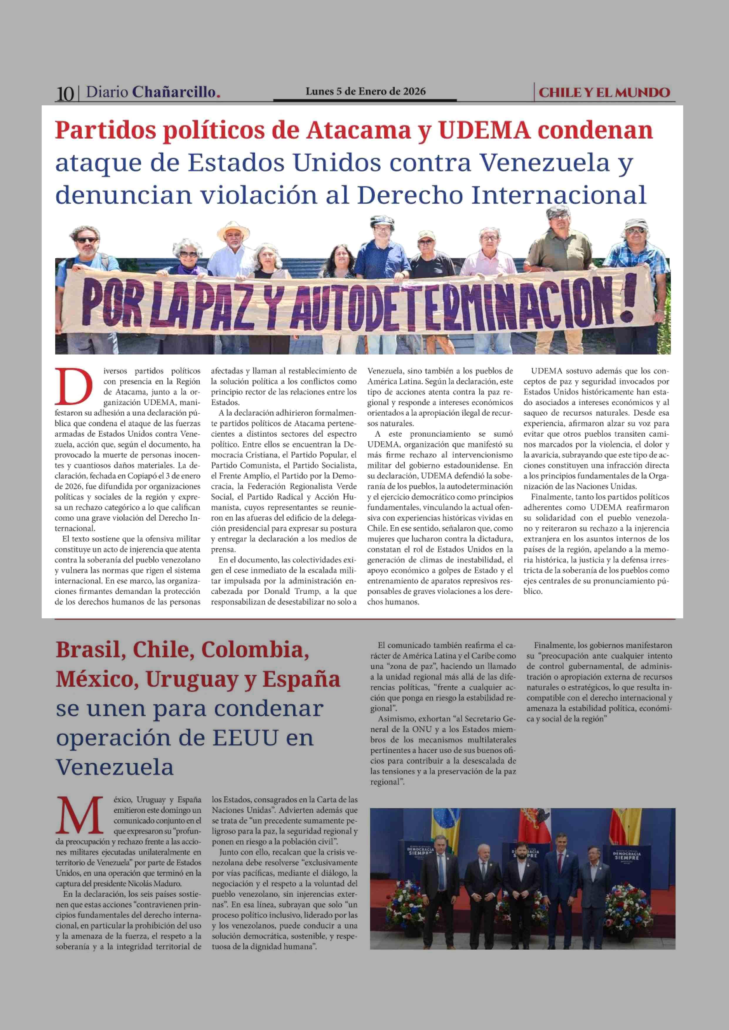 Partidos políticos de Atacama y UDEMA condenan ataque de Estados Unidos contra Venezuela y denuncian violación al Derecho Internacional 05-01-2026 Diario Chañarcillo |