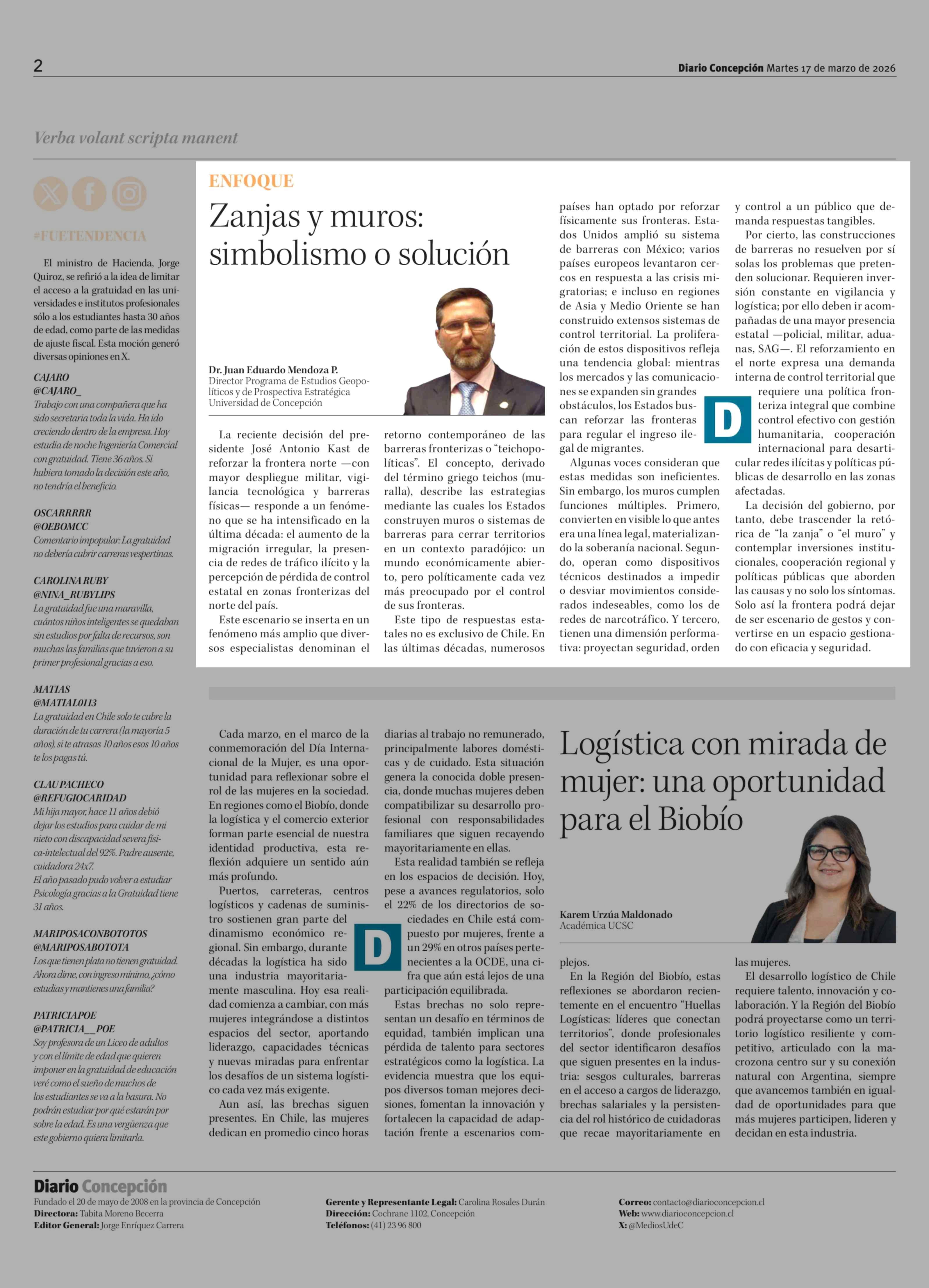 Columnas de Opinión: Zanjas y muros: simbolismo o solución 17-03-2026 Diario Concepción |